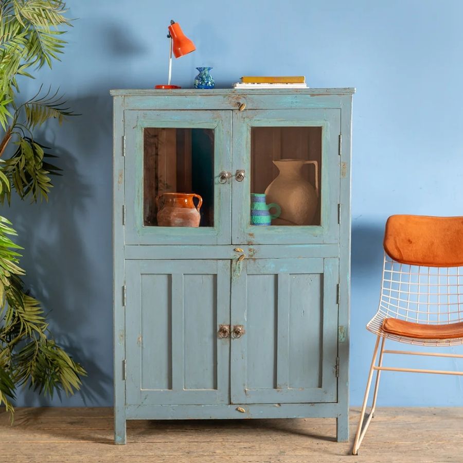 Light Blue Vintage Wooden Cupboard with Glass & Panelled Doors
