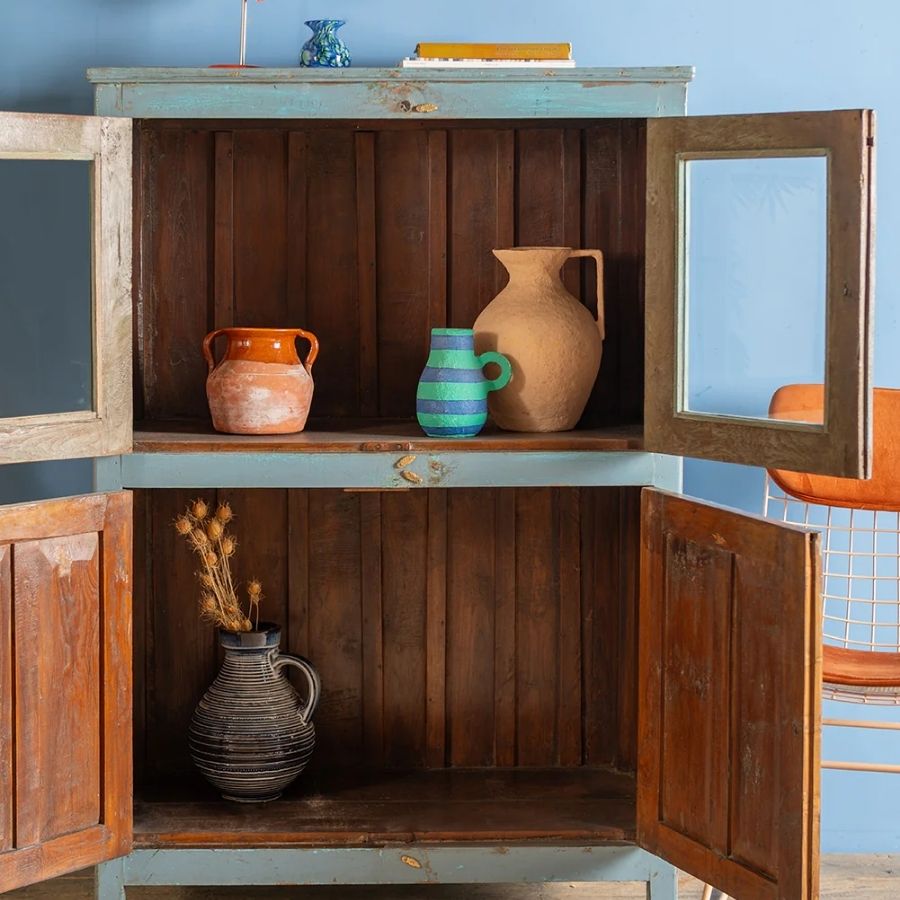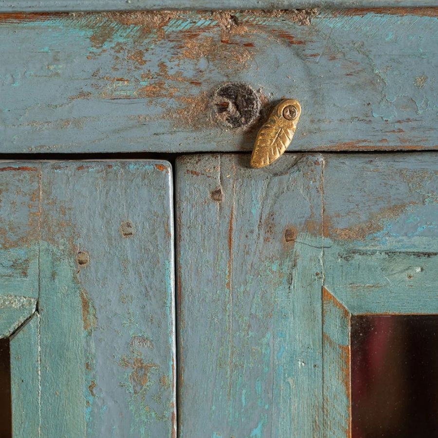 The soft light blue exterior creates a calm and inviting look, while the warm natural wood interior adds richness and contrast. Perfect for a lounge, dining area, or hallway, this cupboard brings delicate vintage charm and everyday functionality to any space.