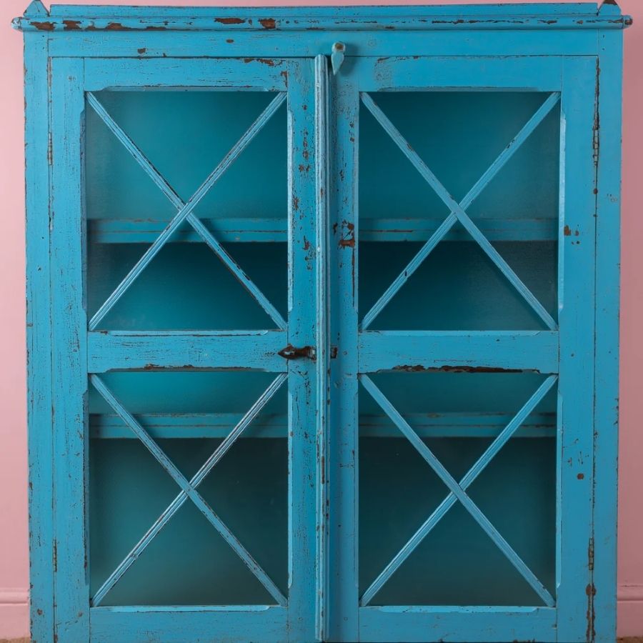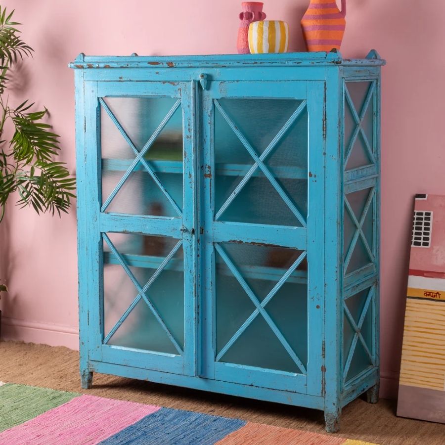 Light Blue Vintage Wooden Textured Glass Display Cabinet