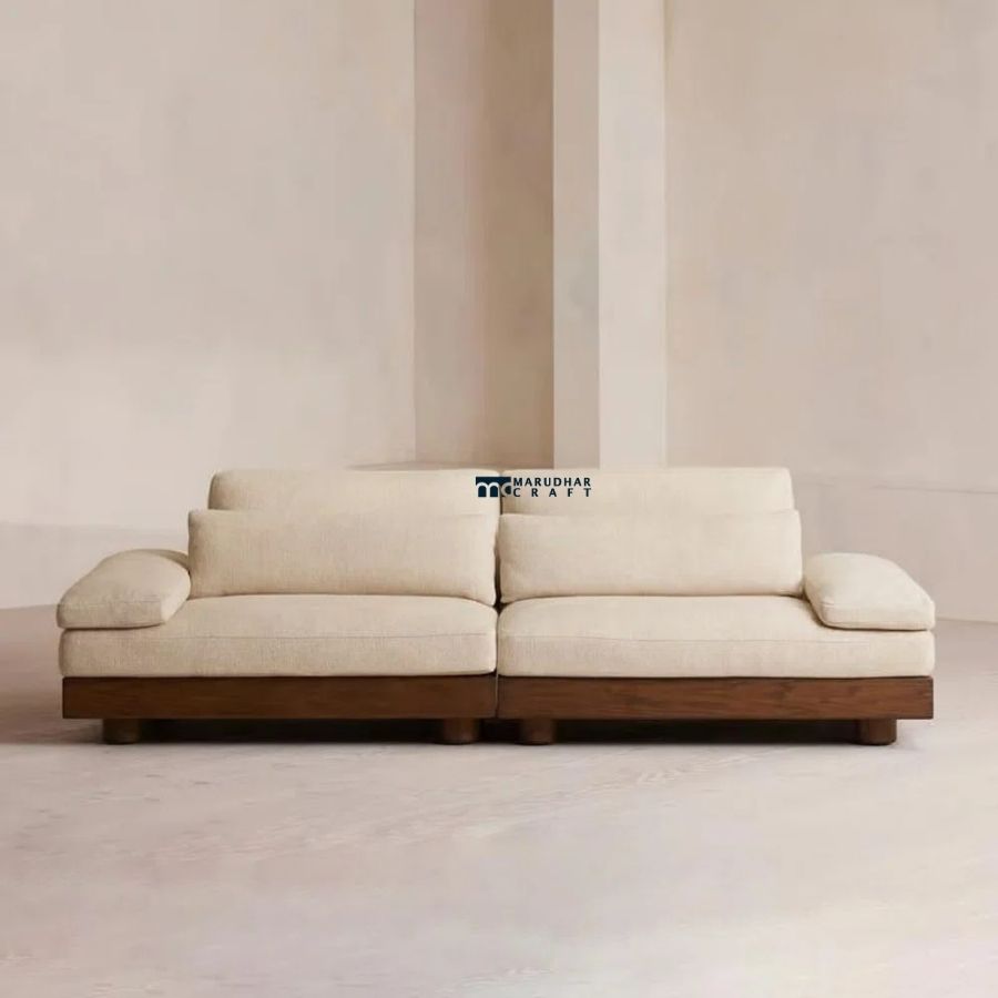 This luxury low-profile 3-seater sofa features a minimalist silhouette with plush beige fabric upholstery and a solid wooden base. Designed for relaxed lounging and modern elegance, it offers deep seating and soft cushioning, making it a perfect centerpiece for contemporary and premium interiors.