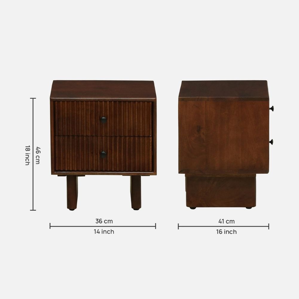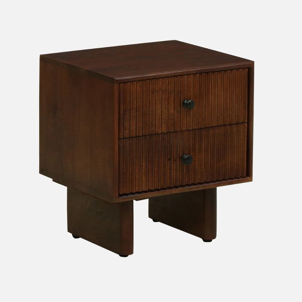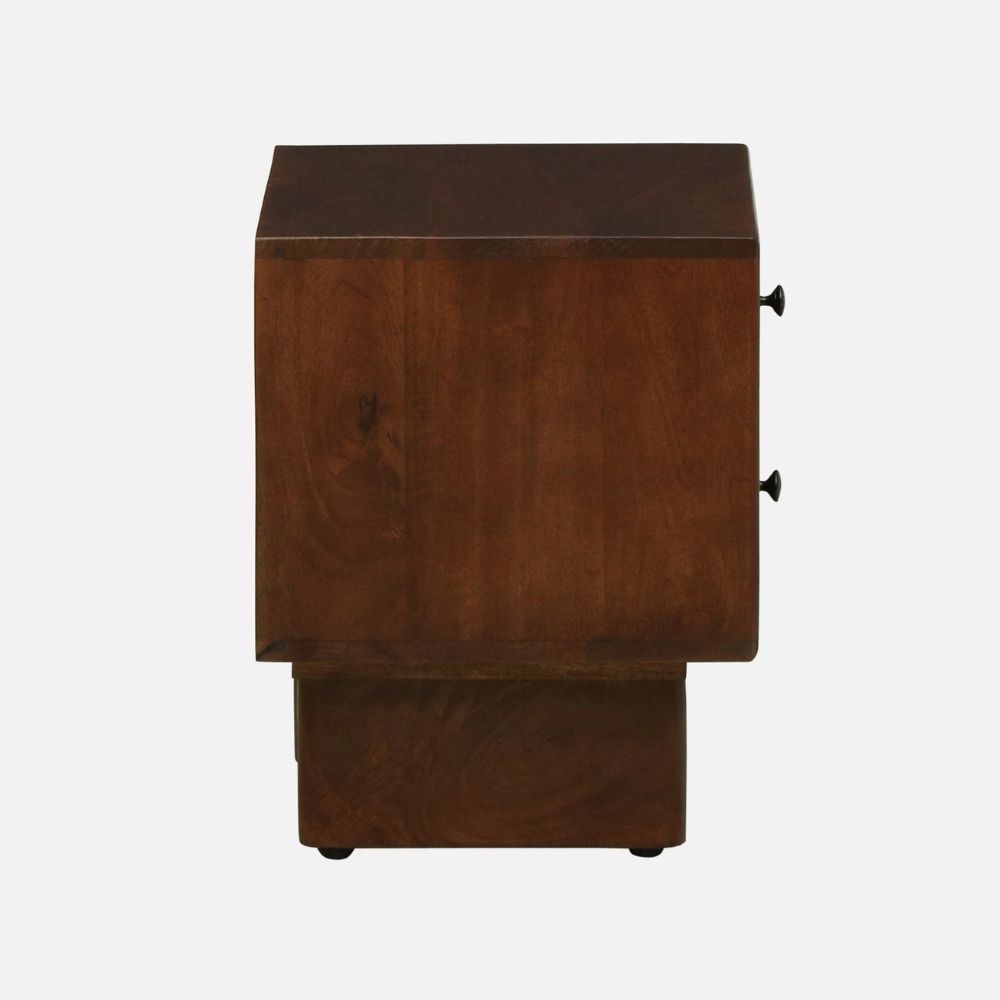 Crafted from premium solid mango wood, this bedside table features a rich Tubbaq finish that enhances its natural grain and warm character. Designed with two smooth-glide drawers, it offers ample storage for your nightly essentials while adding a stylish, contemporary touch to your bedroom décor.