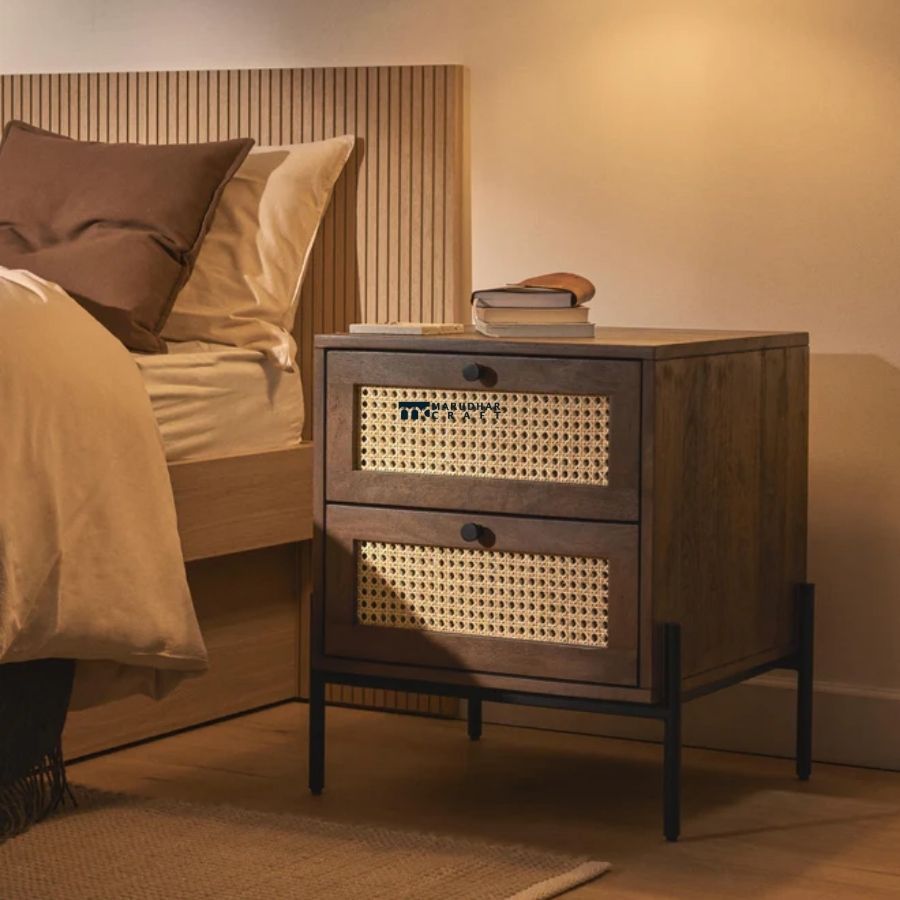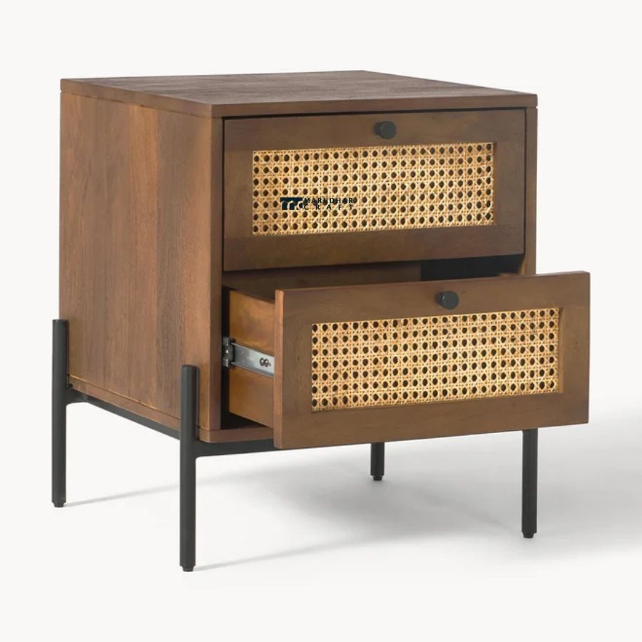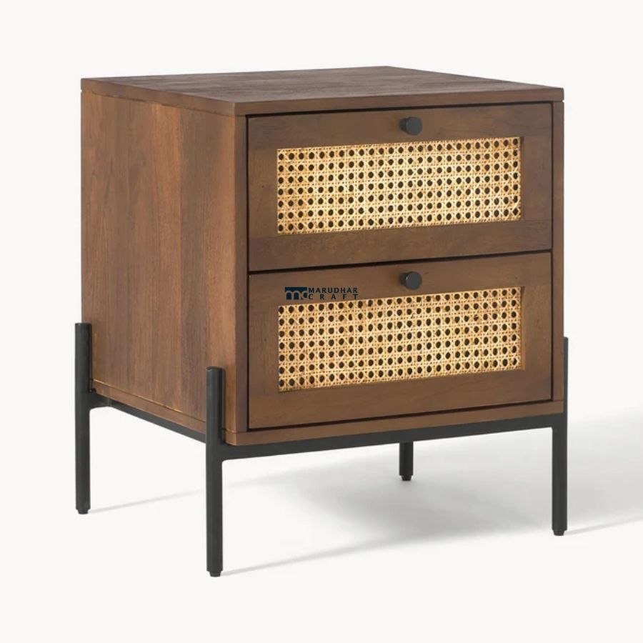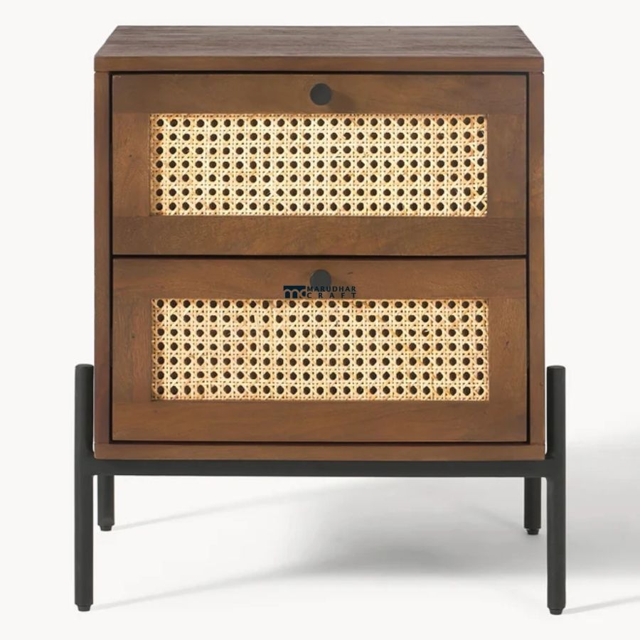 A perfect blend of mid-century charm and industrial design, this bedside table from Marudhar Craft features a warm walnut-finished solid wood frame. The highlight of the piece is the intricate natural cane rattan weaving on the drawer fronts, offering a breathable, organic texture. It is supported by a sturdy, minimalist black metal base, making it a versatile addition to modern, bohemian, or industrial-themed bedrooms.