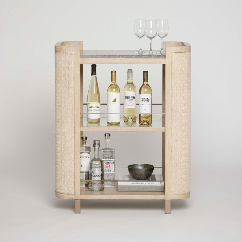 • Spacious shelving for beverages, glassware, bar tools, and décor pieces.