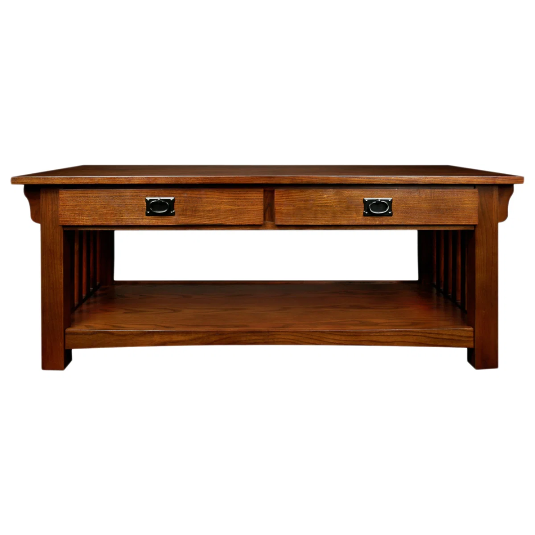 The Loon Peak mission impeccable coffee table features a natural wood grain appearance, blackened ironware, and slatted sides for authentic mission appeal. Finished in beautiful medium oak, this quality crafted living room table has two deep drawers that will tidy up your space, leaving a vast top positioned at the center of family life. All solid wood construction and dovetail drawers ensure this table will stand the test of time. Designed and manufactured by Loon Peak, the trusted source for quality home furnishings for every taste and budget.