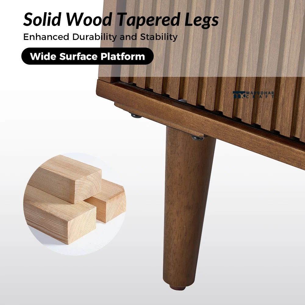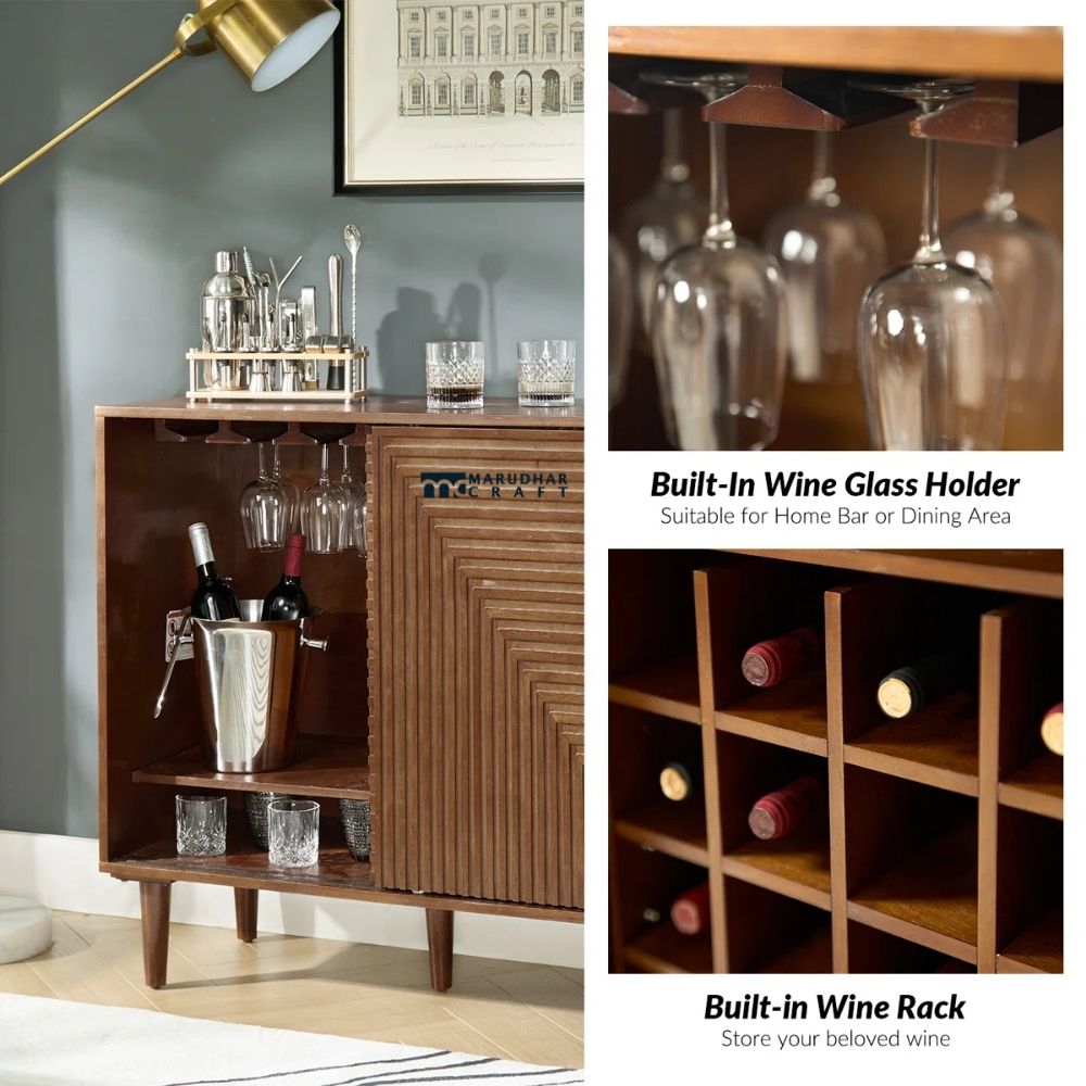 This mid-century modern accent cabinet is designed to combine style, storage, and functionality in a compact 36-inch width, making it ideal for Indian homes and apartments. Crafted from solid wood, it features a sturdy structure with two doors that open to ample storage space. The built-in wine rack allows you to neatly organize bottles while using the cabinet for multiple purposes such as a bar unit, sideboard, or storage cabinet. Its clean lines and retro-inspired design add a sophisticated touch to living rooms, dining areas, or entertainment spaces.