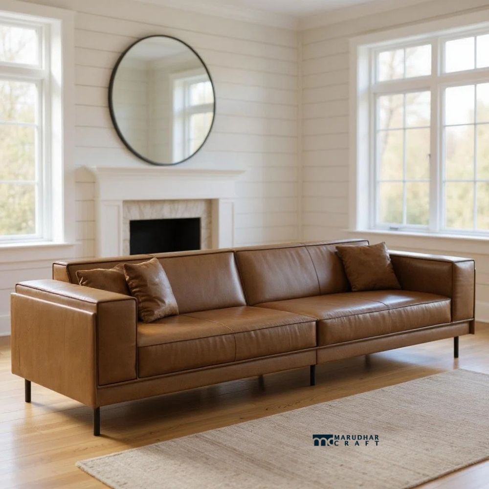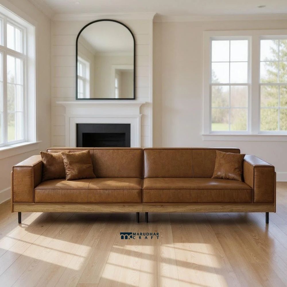 Inspired by mid century modern design, this four-seater leather sofa brings a bold yet refined presence to Indian interiors. Upholstered in premium-quality leather, it offers a smooth feel and long-lasting comfort. The wide armrests provide excellent support and add to the sofa’s strong visual appeal. Built with a sturdy internal structure, this sofa is ideal for spacious living rooms, creating a perfect balance of style, comfort, and durability for everyday family use and formal gatherings.