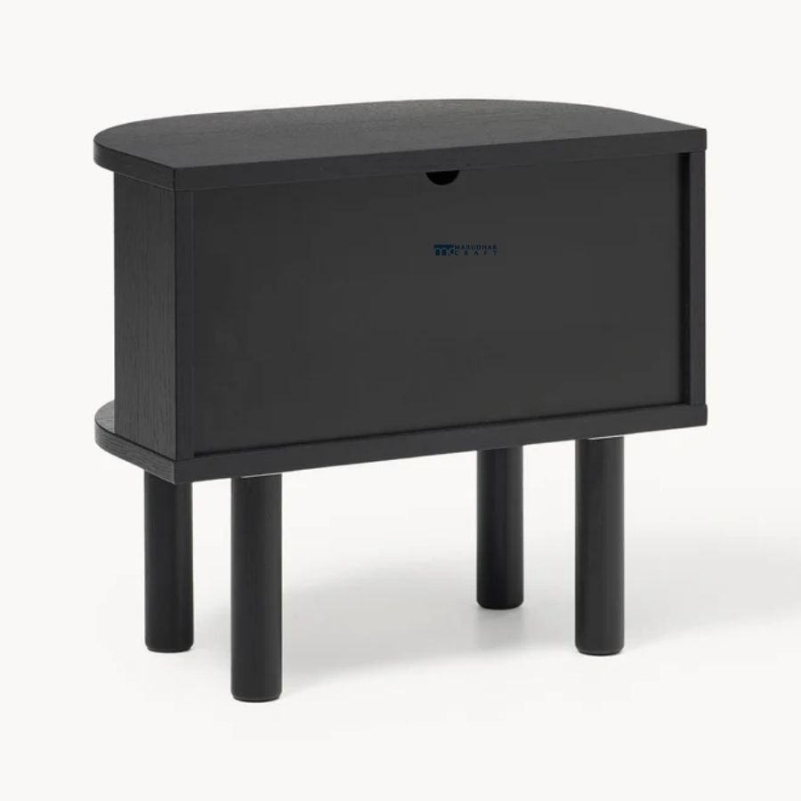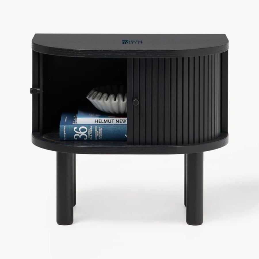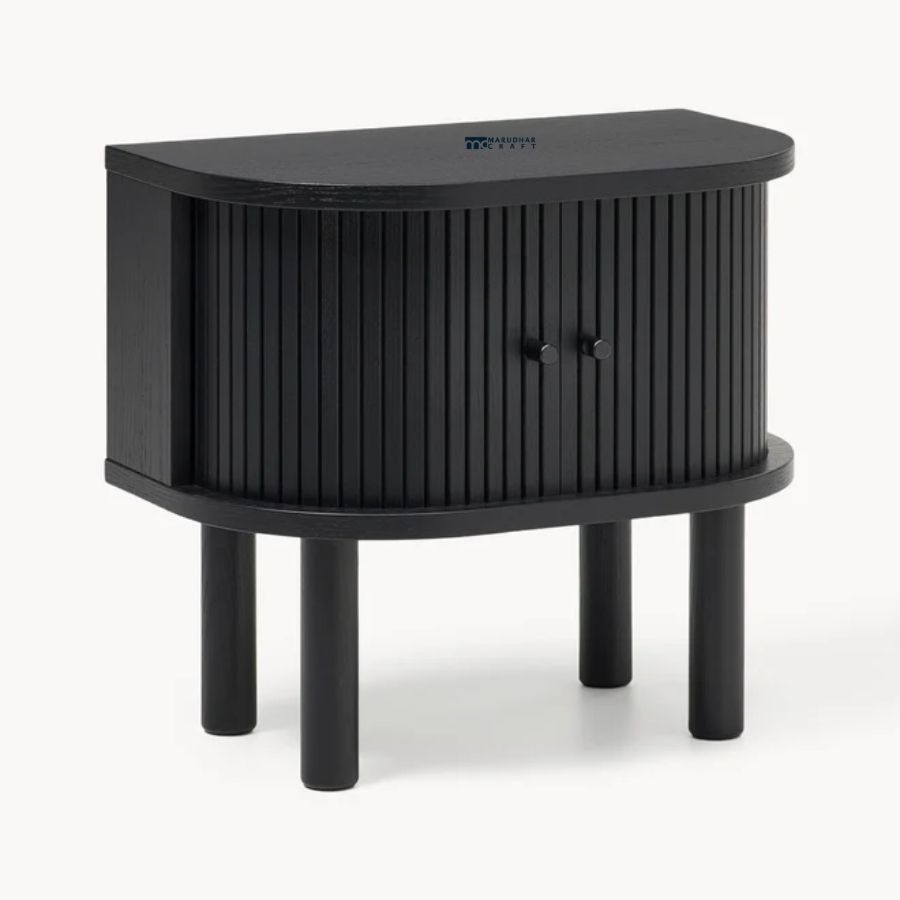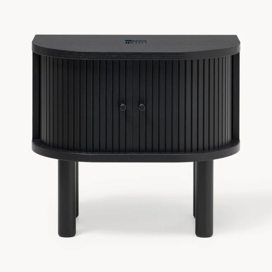 Elevate your bedside with this sophisticated nightstand, blending retro-inspired design with a clean, contemporary aesthetic. Featuring a distinctive curved silhouette and textured tambour sliding doors, this piece offers a unique tactile element to your bedroom. The sleek matte black finish is perfectly complemented by minimalist cylindrical legs, making it a versatile addition to modern, industrial, or Japandi-style interiors.