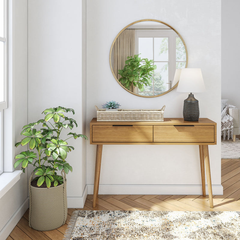 Bring home the clean lines and timeless appeal of mid-century design with this Modern Console Table featuring built-in storage. Crafted from solid wood, it carries smooth contours, tapered legs and a warm natural finish that blends beautifully with Indian décor themes.