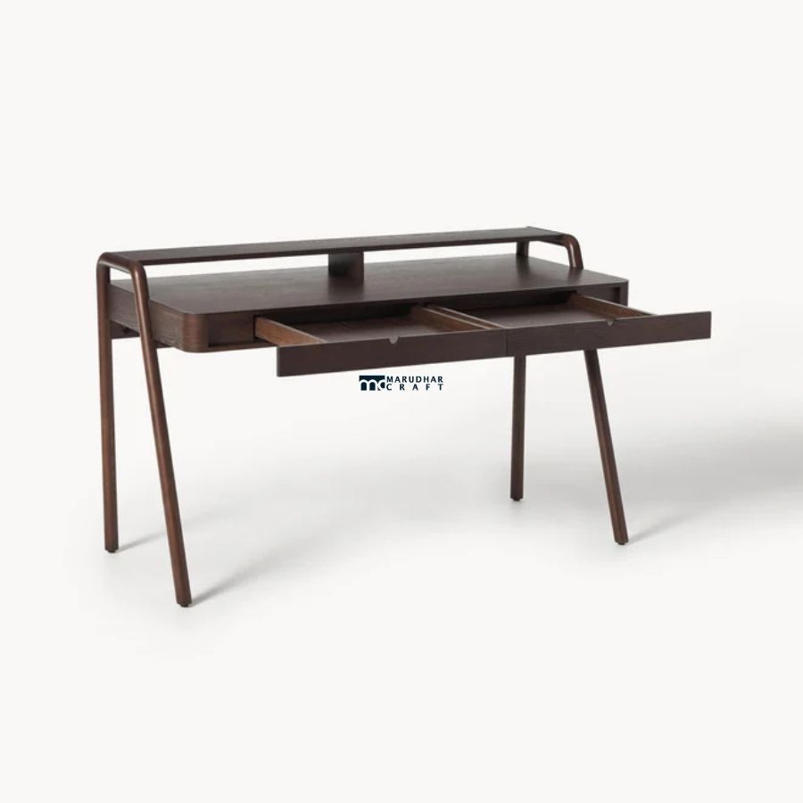 A refined mid-century style writing desk crafted from premium solid wood, featuring a sleek silhouette and an integrated storage shelf with drawers. Designed for both elegance and functionality, it complements modern and classic home office interiors.