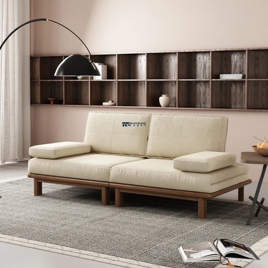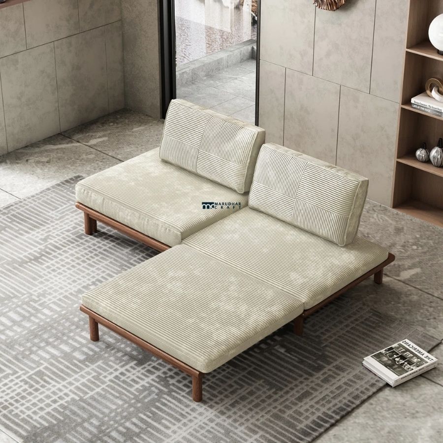 The Minimalist Wooden Platform Sofa Cum Bed blends modern aesthetics with everyday versatility. Crafted with a sturdy solid wood frame and soft striped fabric cushions, this piece easily transitions from a stylish low-height sofa into a comfortable bed. Its clean lines and neutral tones make it a perfect fit for contemporary living rooms, studios, or guest spaces.
