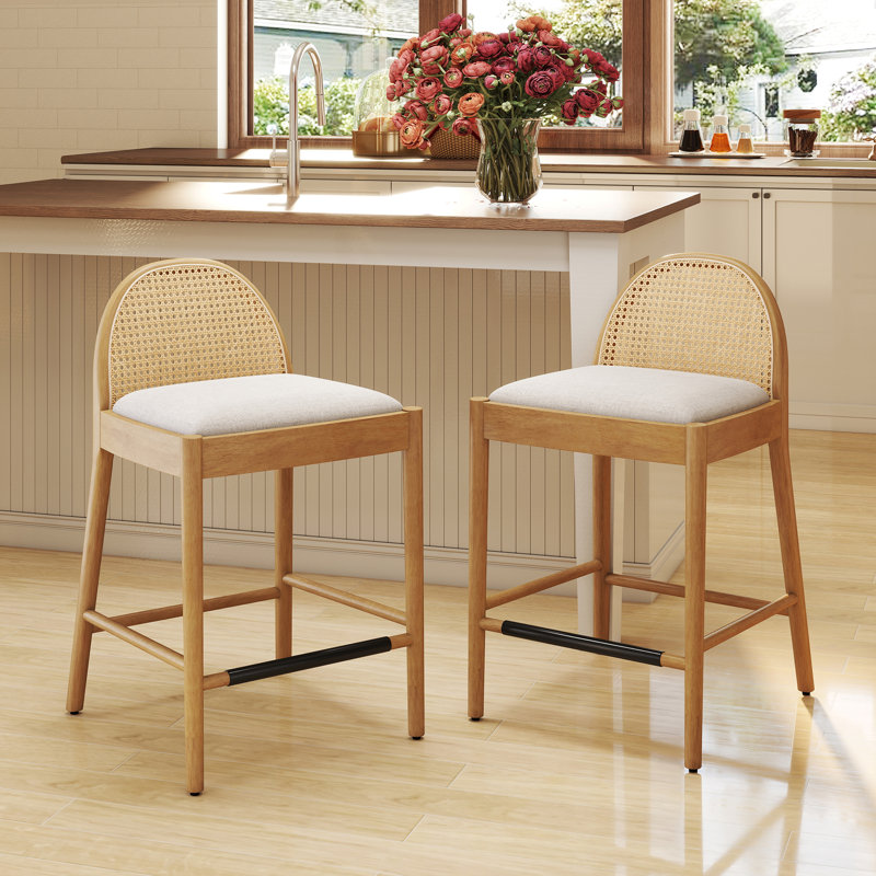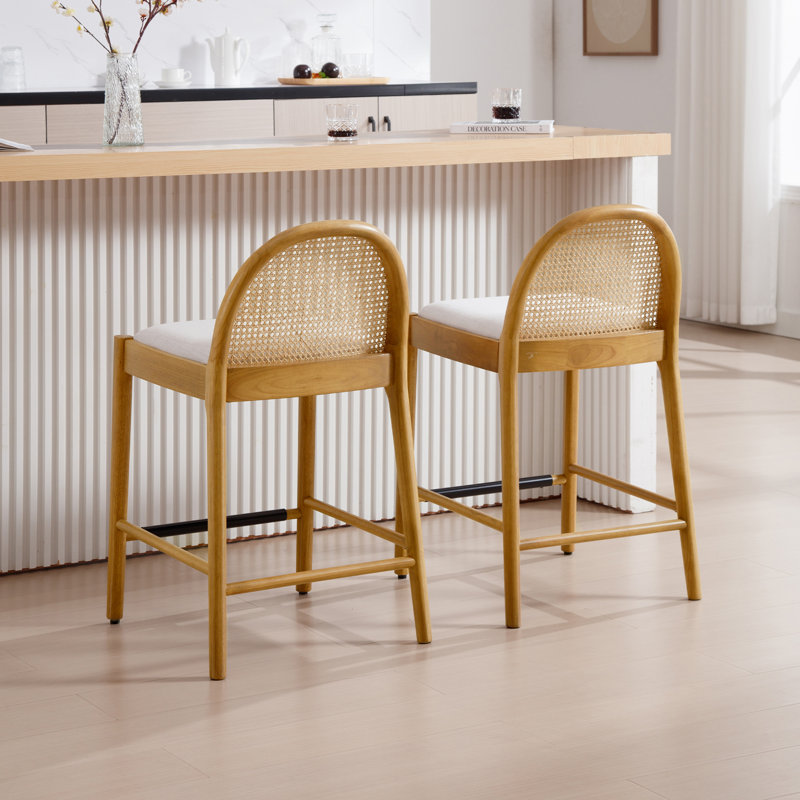 Modern Bar Stools with Rattan Backrest and Solid Wood Frame (Set of 2)