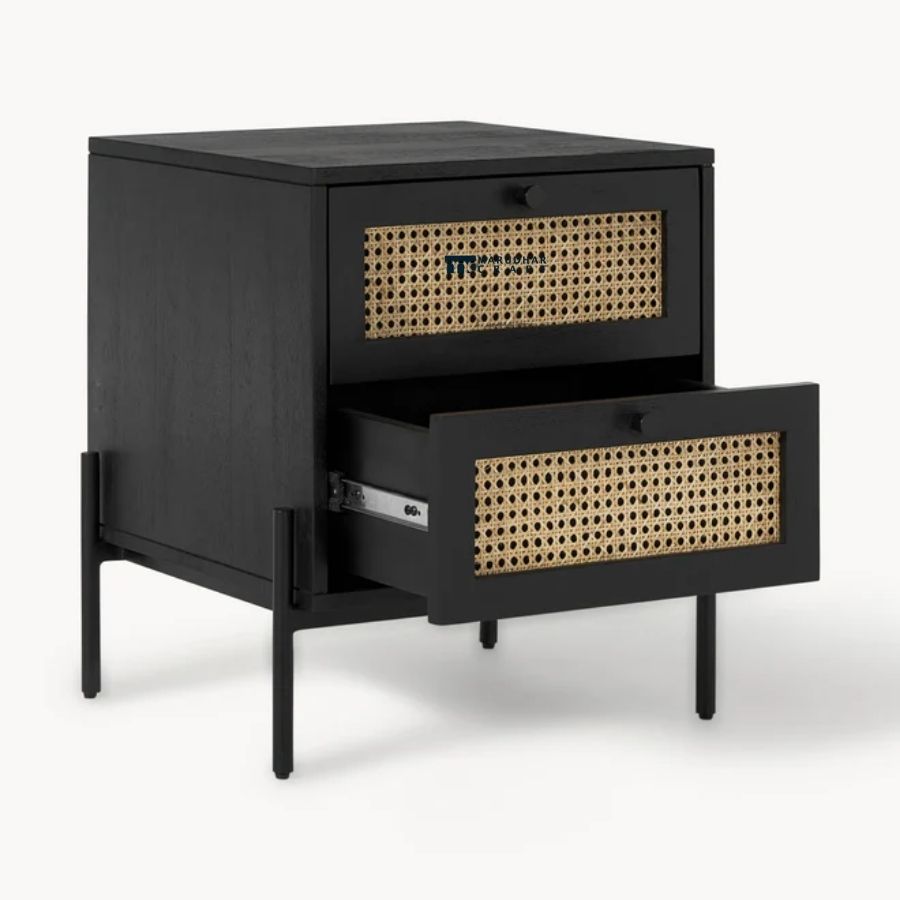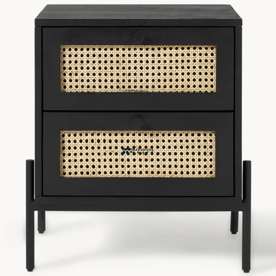 Elevate your bedroom with this stunning fusion of industrial chic and bohemian warmth. This bedside table features a bold matte black frame that beautifully contrasts with natural hand-woven cane webbing on the drawer fronts. The elevated leg design creates a sense of space, while the dual drawers provide generous storage for a clutter-free sanctuary. Handcrafted with precision, this piece brings a sophisticated, organic texture to any modern interior.