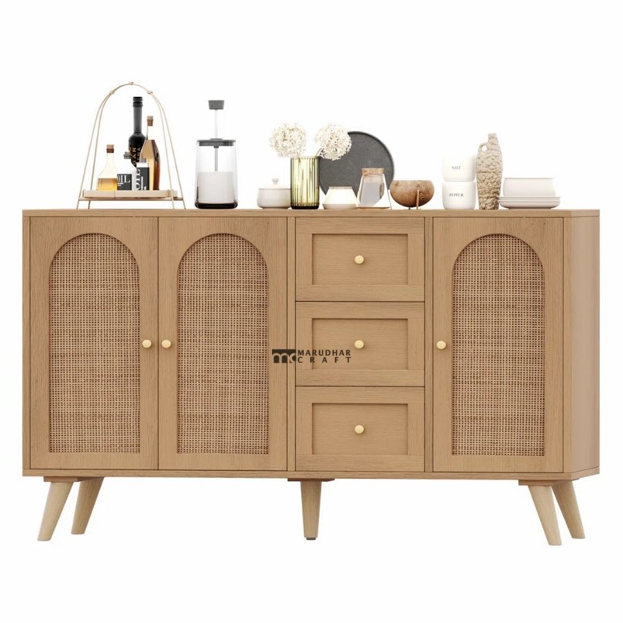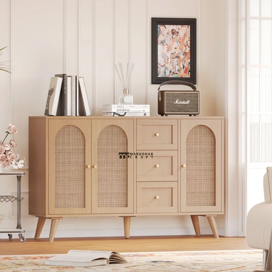 This modern cane panel sideboard blends timeless craftsmanship with contemporary elegance. Featuring beautifully arched woven cane door panels paired with smooth wooden drawers, it creates a warm and inviting aesthetic that suits both modern and classic interiors.