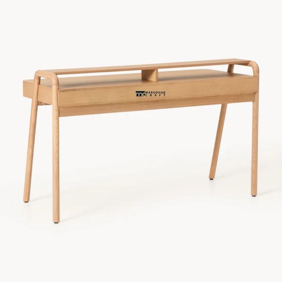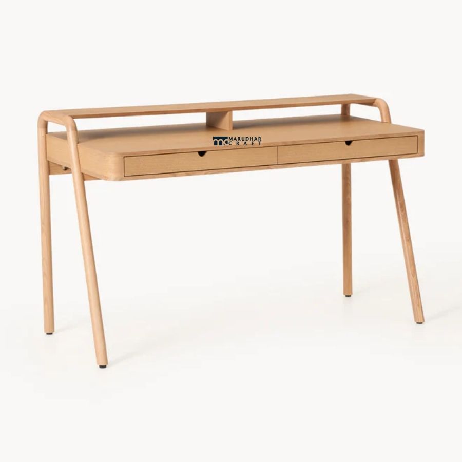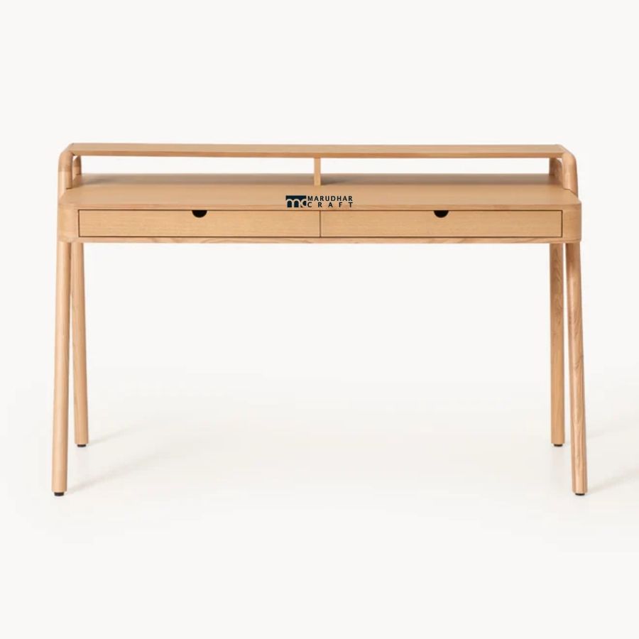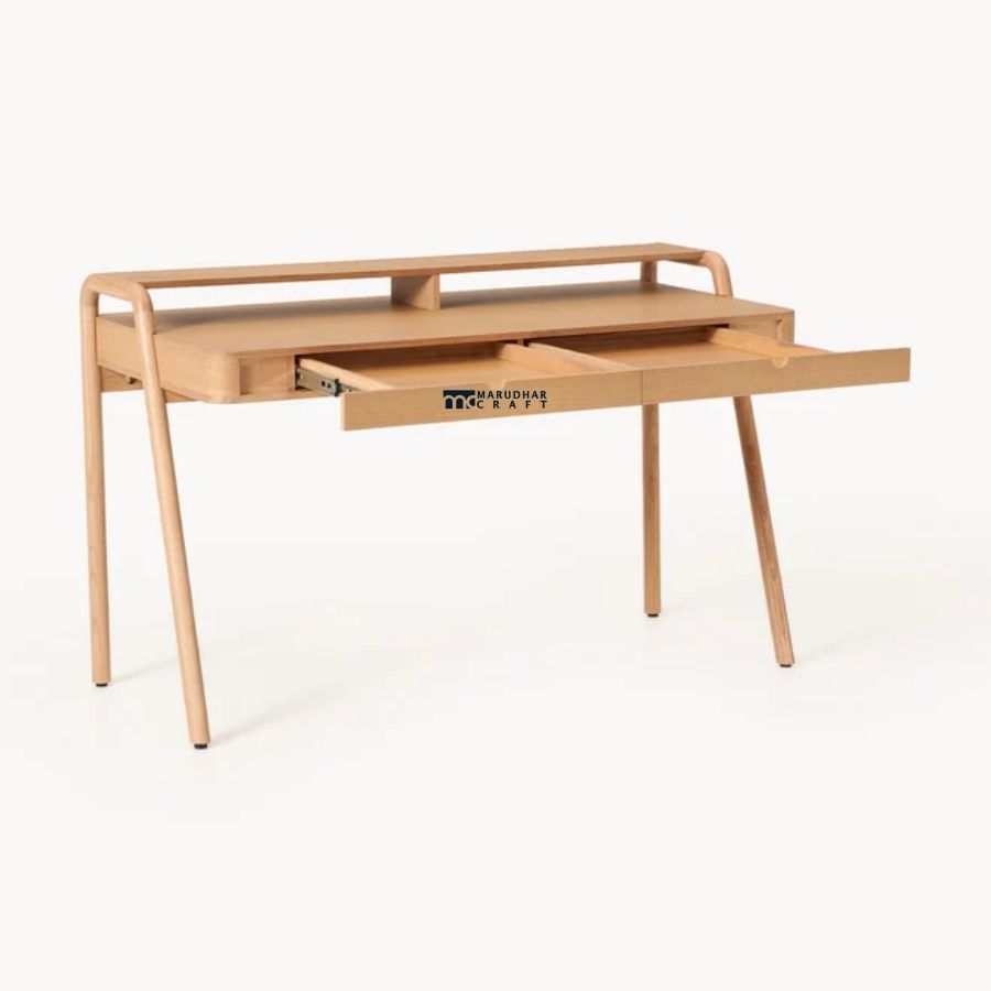 A modern study desk crafted from premium solid wood, featuring elegantly curved legs and a smooth, minimalist profile. Designed to balance style and practicality, it includes a built-in drawer and raised shelf, making it ideal for contemporary home offices and study spaces.