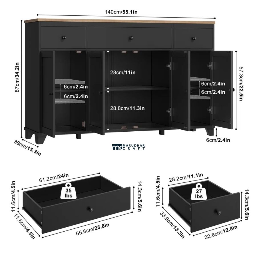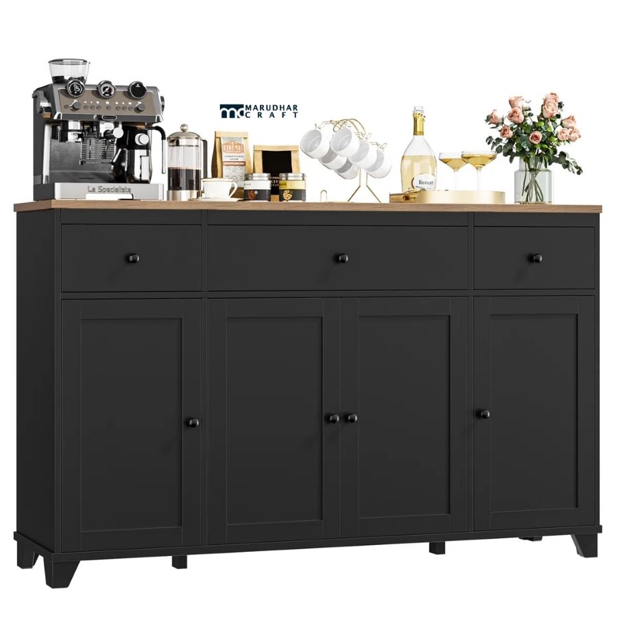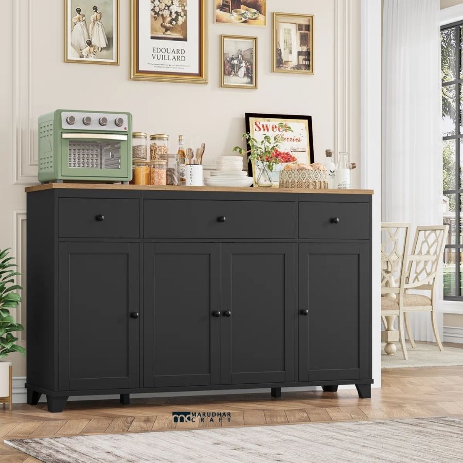 The spacious top drawers provide easy access to essentials, while the lower cabinet doors offer ample concealed storage for crockery, kitchenware, linens, or home accessories. Its minimalist design pairs beautifully with modern, contemporary, and transitional interiors.