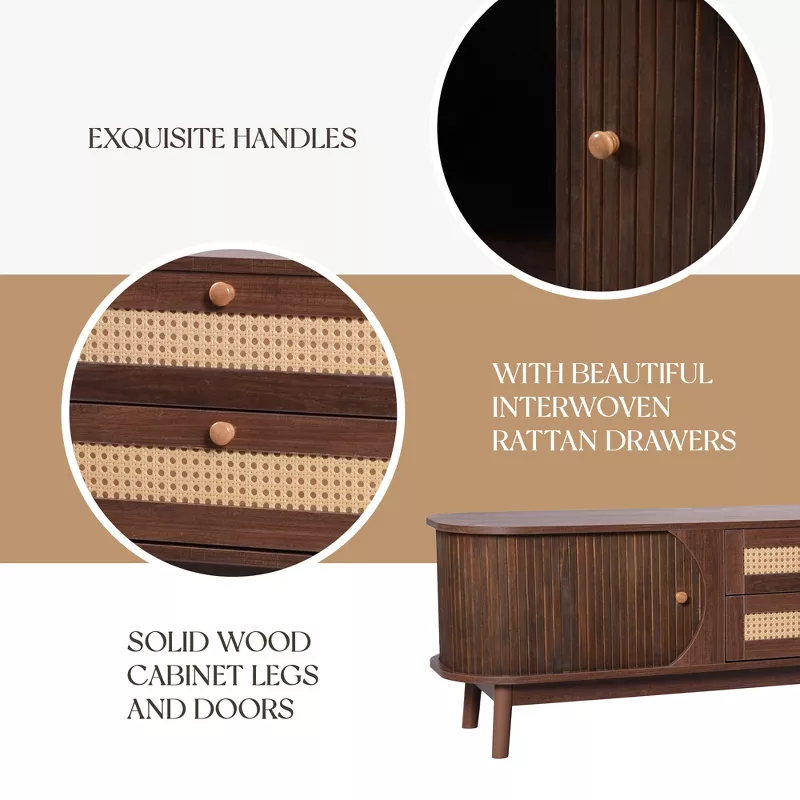 Enhance your living space with this modern media console designed for both style and functionality. Featuring a sturdy wood frame with durable MDF construction, this TV stand offers reliable support for your television and media equipment. Two smooth-glide drawers and enclosed doors provide convenient storage for accessories, remotes, and entertainment essentials, helping keep your space neat and organized. Its clean, contemporary design makes it a perfect addition to modern living rooms and media areas.