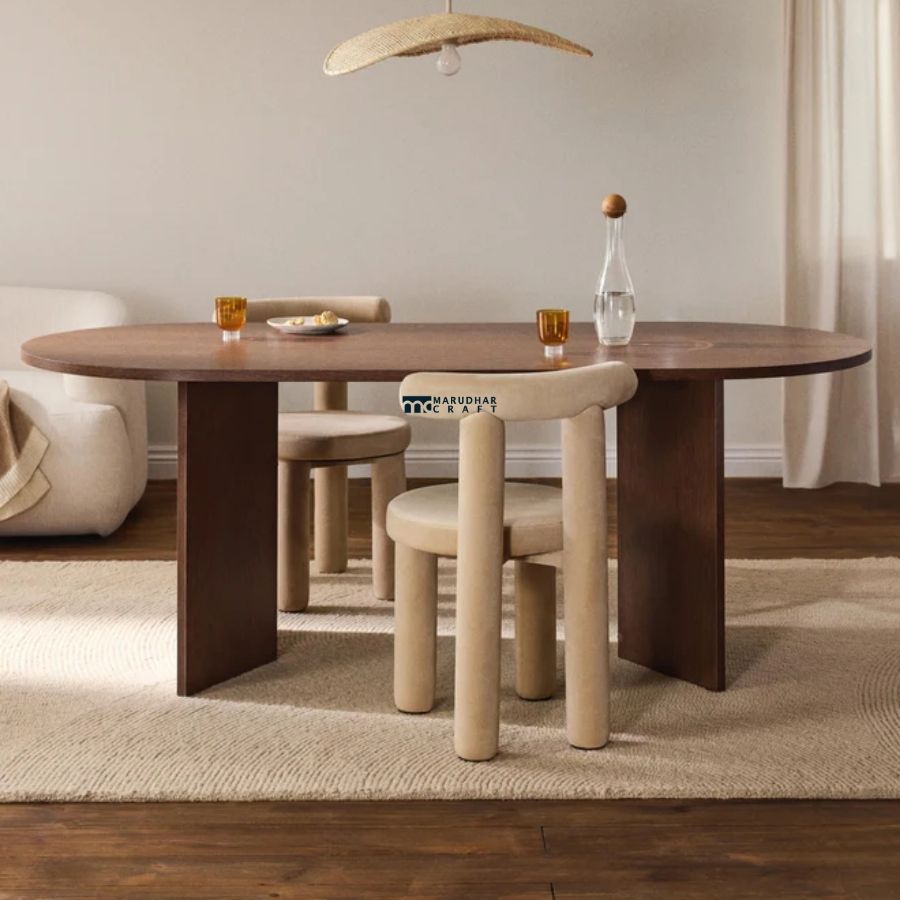 Elevate your dining space with this modern oval dining table set, featuring a solid wooden table paired with elegantly upholstered chairs. Designed with clean lines and a warm natural finish, this set blends contemporary aesthetics with everyday comfort, making it ideal for both casual meals and formal gatherings.