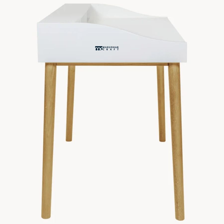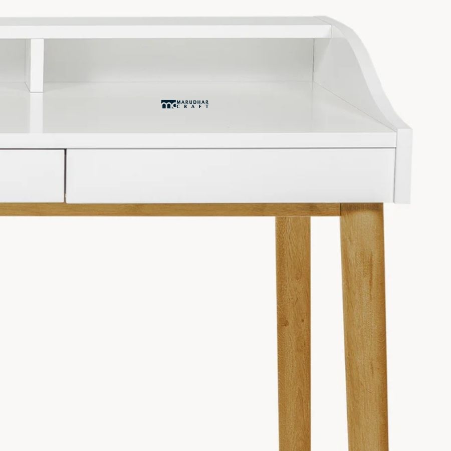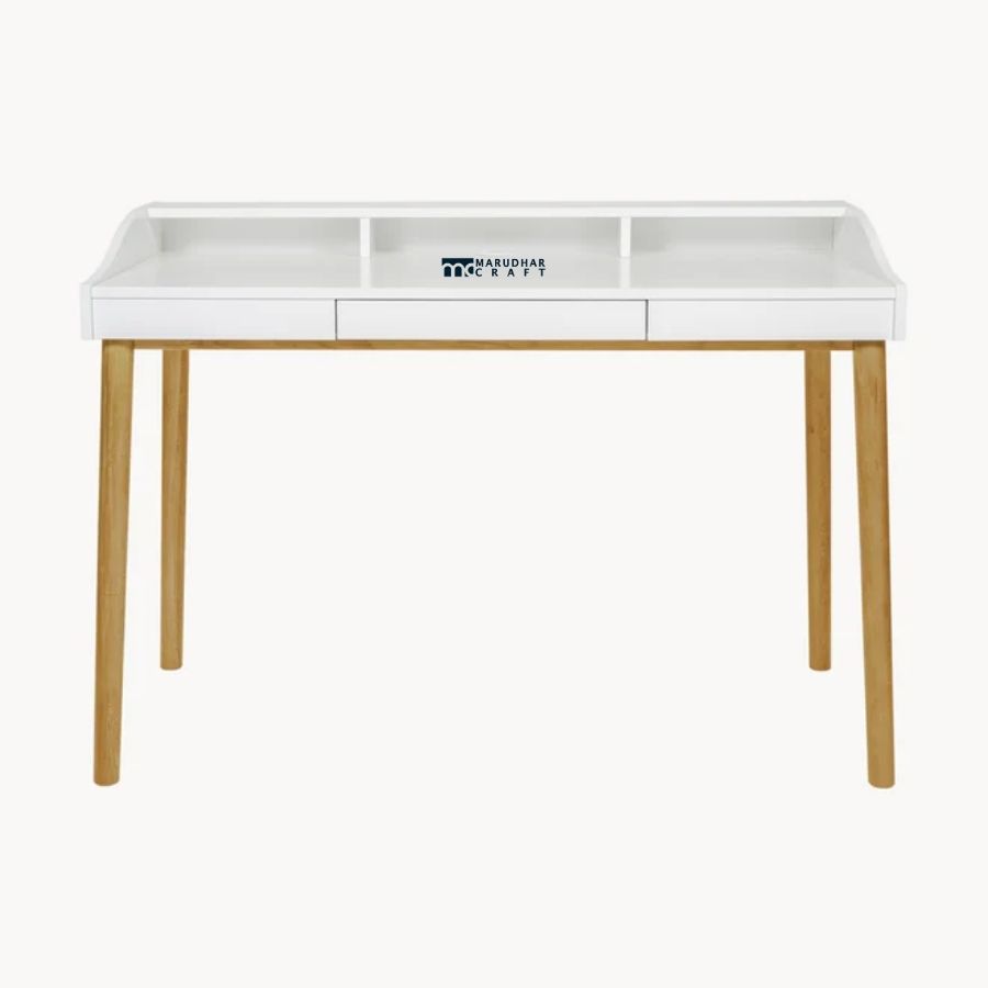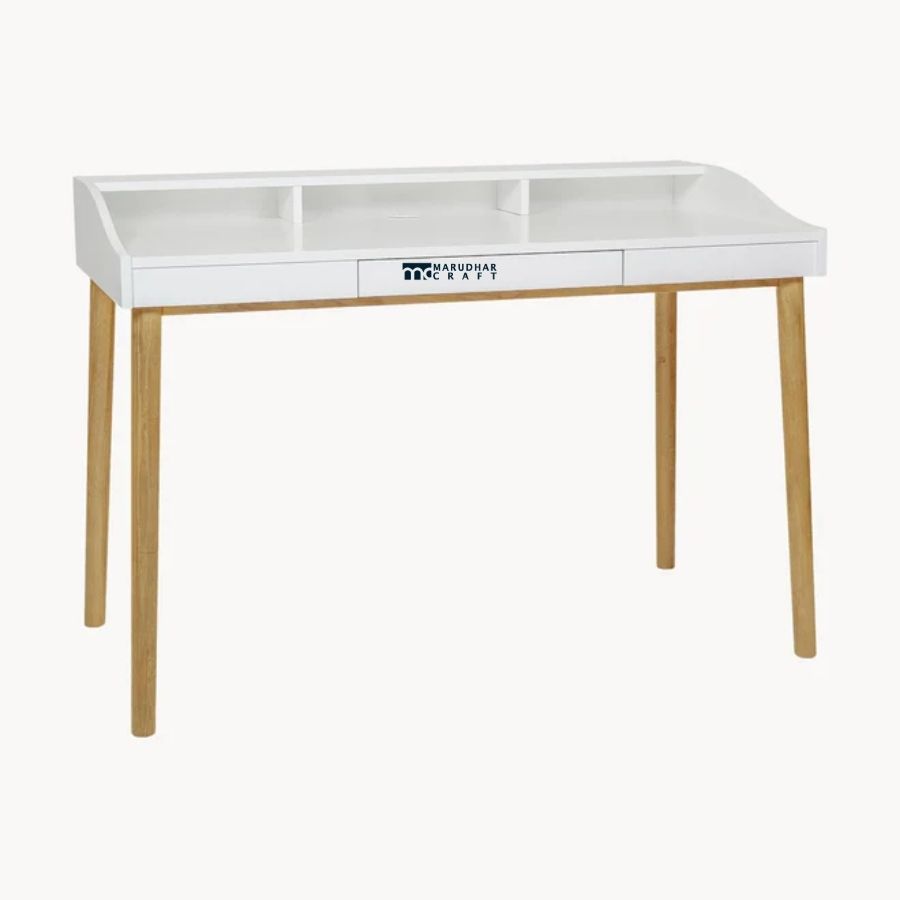 A modern study desk featuring a sleek white tabletop paired with solid wood legs for a warm, contemporary look. Designed for bright and airy interiors, it offers a clean, functional workspace ideal for home offices and study rooms.