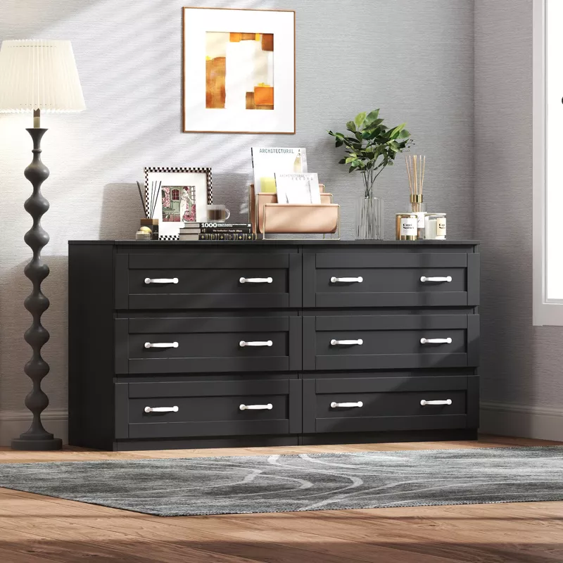 With six easy-glide drawers, this wide dresser provides plenty of space to store clothing, accessories, and household essentials while keeping everything neatly organized. Its large top surface is ideal for displaying décor, photo frames, or a table lamp.