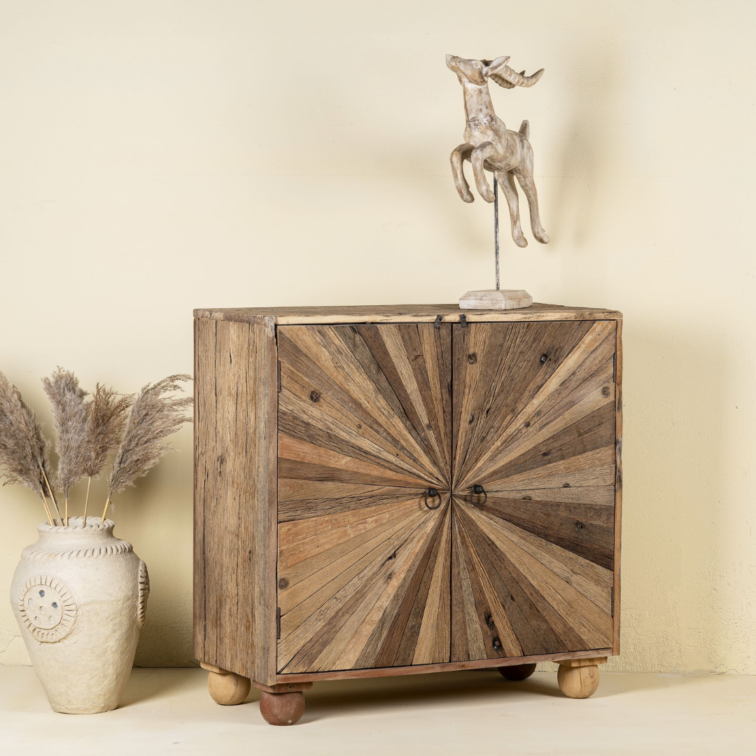 Add a touch of rustic minimalistic charm to your home with this stunning handcrafted cupboard, made from reclaimed wood. Featuring an eye-catching sunburst pattern on the doors, this piece is a true work of art, blending natural textures and earthy tones for a warm and inviting look.