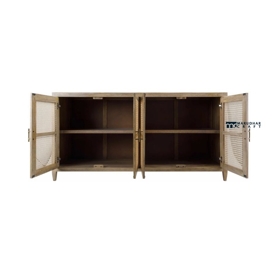 Elevate your interiors with this natural cane front wooden sideboard cabinet, designed to bring warmth, texture, and timeless appeal to your space. Featuring beautifully woven cane panel doors framed in solid wood, this piece blends classic craftsmanship with modern minimalism.
