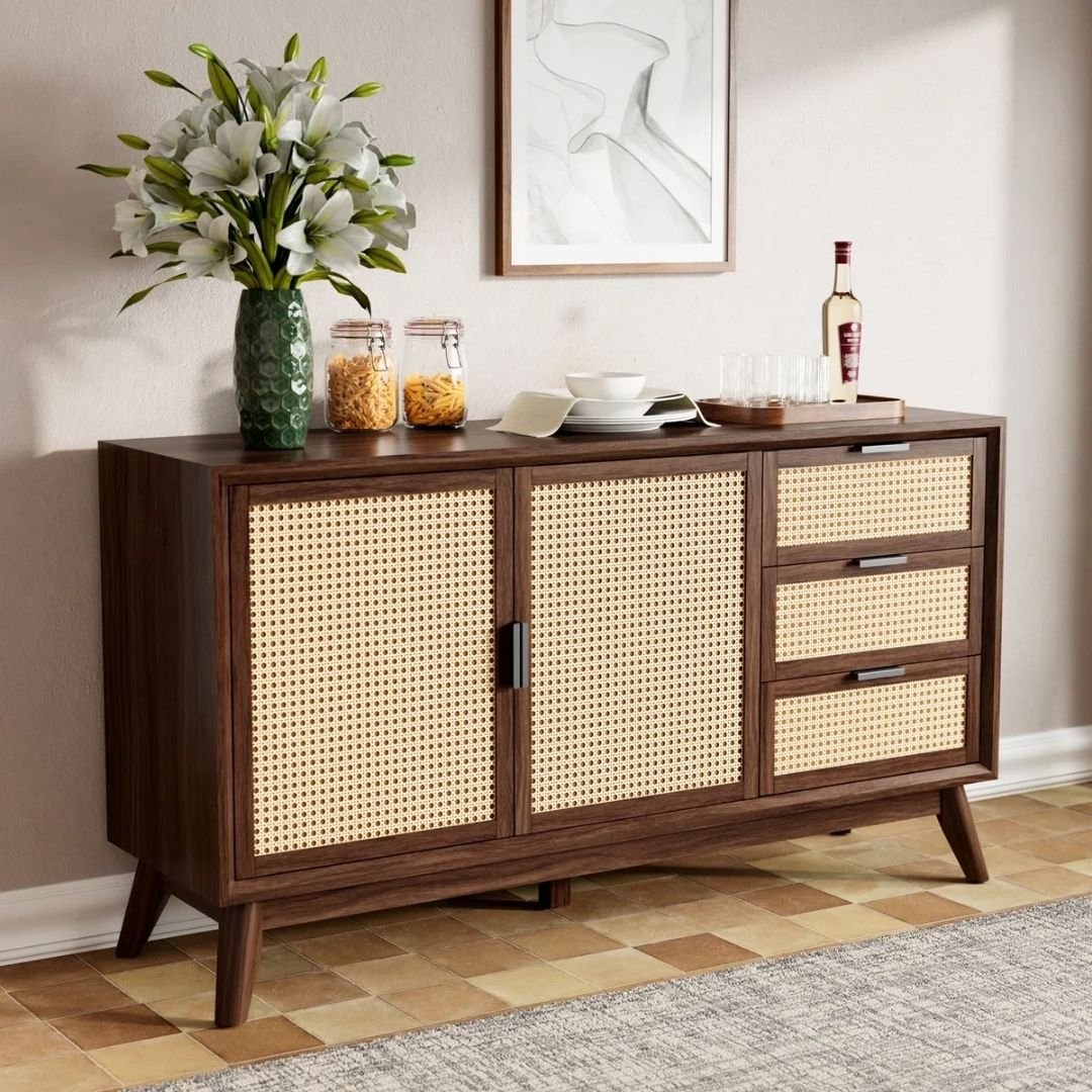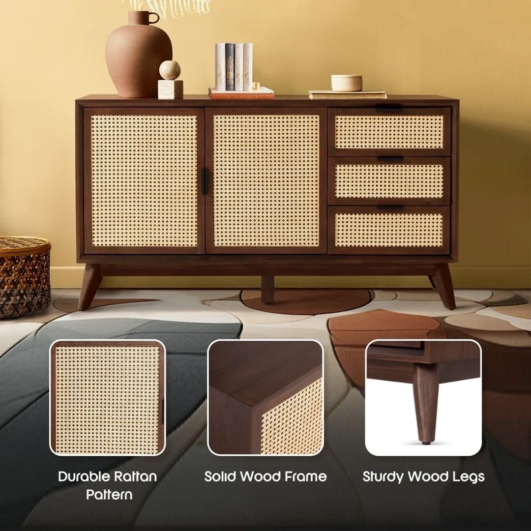 - Accent rattan doors: Our rattan sideboard boasts two accent rattan doors with a protective backing, ensuring secure and stylish storage while preventing dust from getting inside the storage space