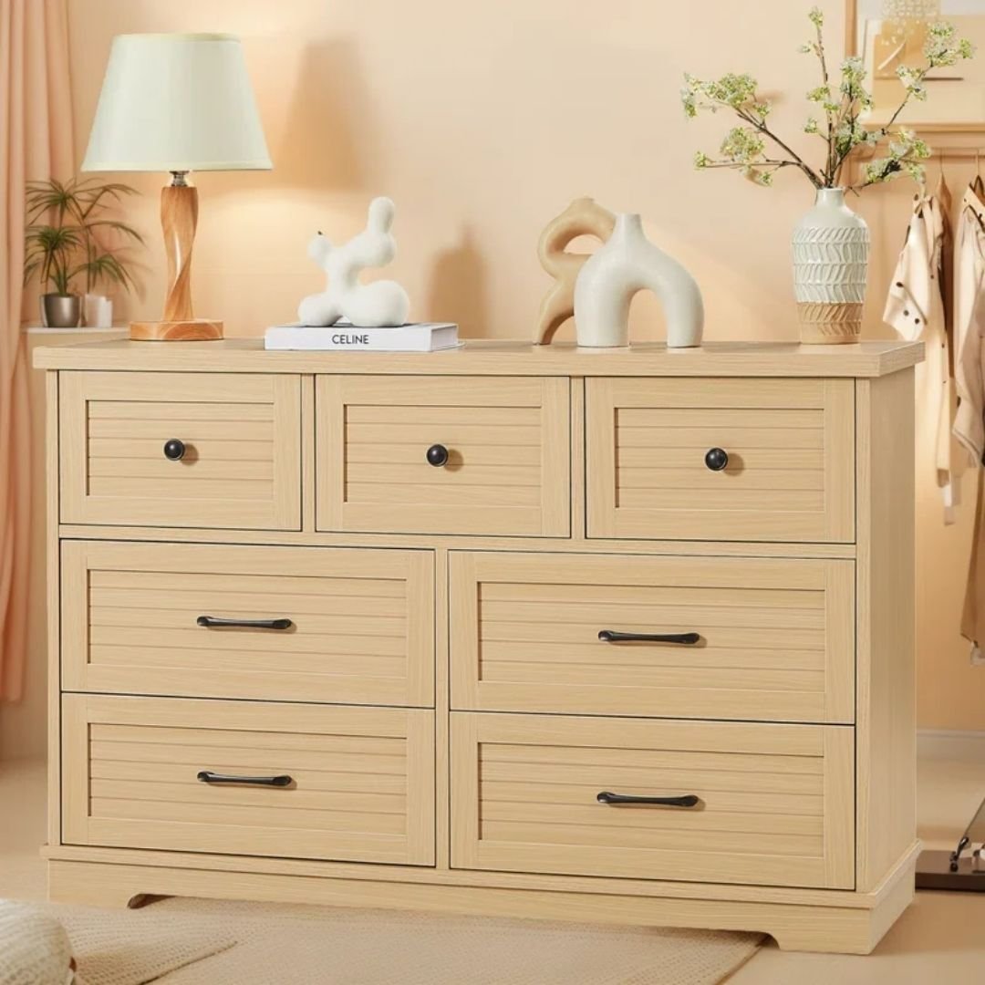 - Ample Storage Space: Overall Dimensions: 46.8″ x 14.8″ x 30.8″. The bedroom dresser features 7 spacious drawers, providing versatile storage for organizing items such as shirts, underwear, socks, baby essentials, and children’s toys. The spacious 52″ x 16″ countertop is ideal for lamps, decor, or photos. This can help organize your stuffs separately and orderly.