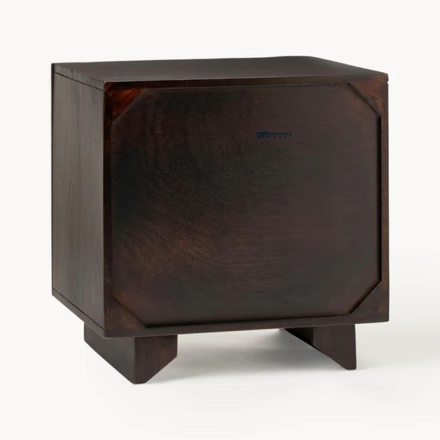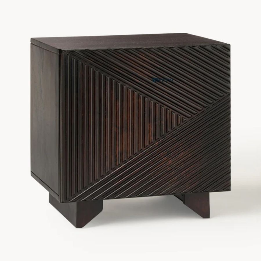 Make a bold architectural statement with this dark espresso nightstand, featuring an intricate, hand-carved fluted design. The geometric, multi-directional grooved patterns on the facade create a sophisticated play of light and shadow, turning a functional storage piece into a modern work of art. Crafted with a minimalist cube silhouette and supported by subtle block feet, this nightstand adds dramatic texture and depth to contemporary or industrial-inspired bedrooms.
