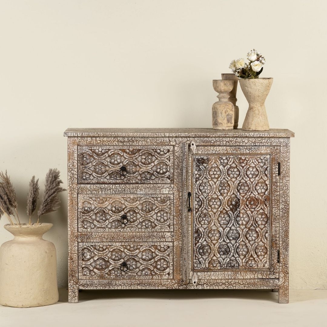 Nritya Tribal Motif Hand Carved Sideboard In Vintage Style 120cm