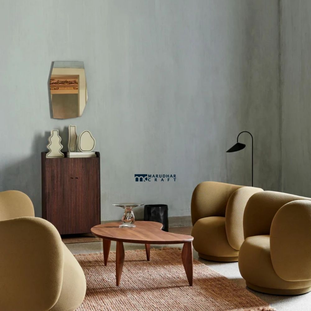 This organic shaped walnut wood coffee table is inspired by natural forms and crafted to add warmth and sophistication to Indian living spaces. Made from premium walnut wood, it features soft curves and a free-flowing shape that creates a unique visual appeal. The rich natural finish highlights the deep tones and grain of walnut, making each table one of a kind. Ideal for everyday use, this coffee table serves as a stylish centrepiece while blending seamlessly with modern and luxury Indian interiors.