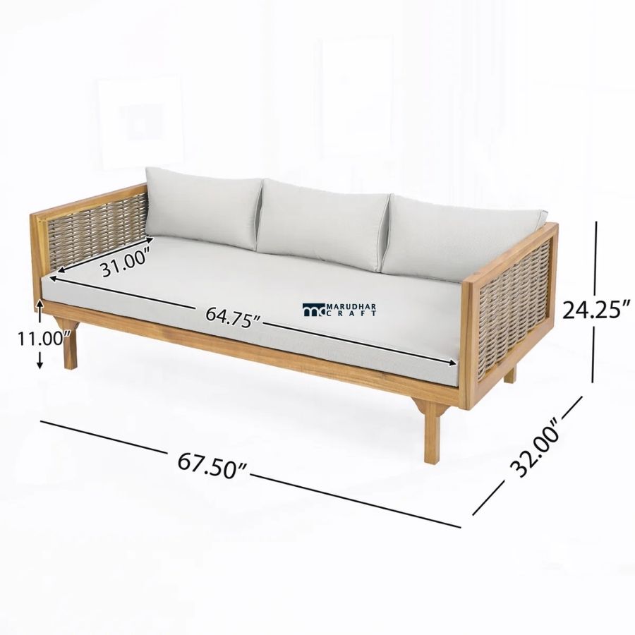 This elegant outdoor daybed sofa blends natural charm with relaxed comfort. Crafted with a solid wooden frame and woven cane arm panels, it features soft, weather-friendly cushions, making it perfect for patios, gardens, verandas, or poolside lounging.