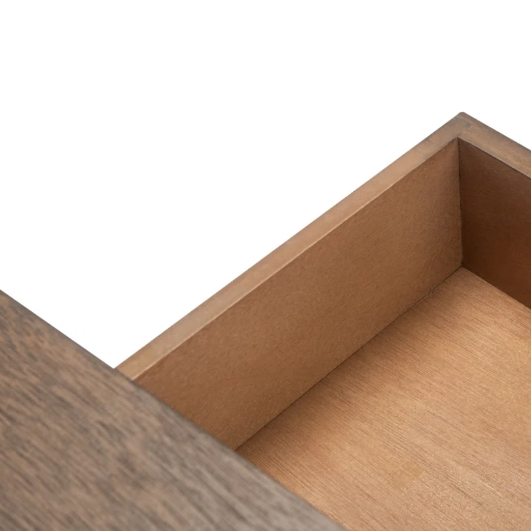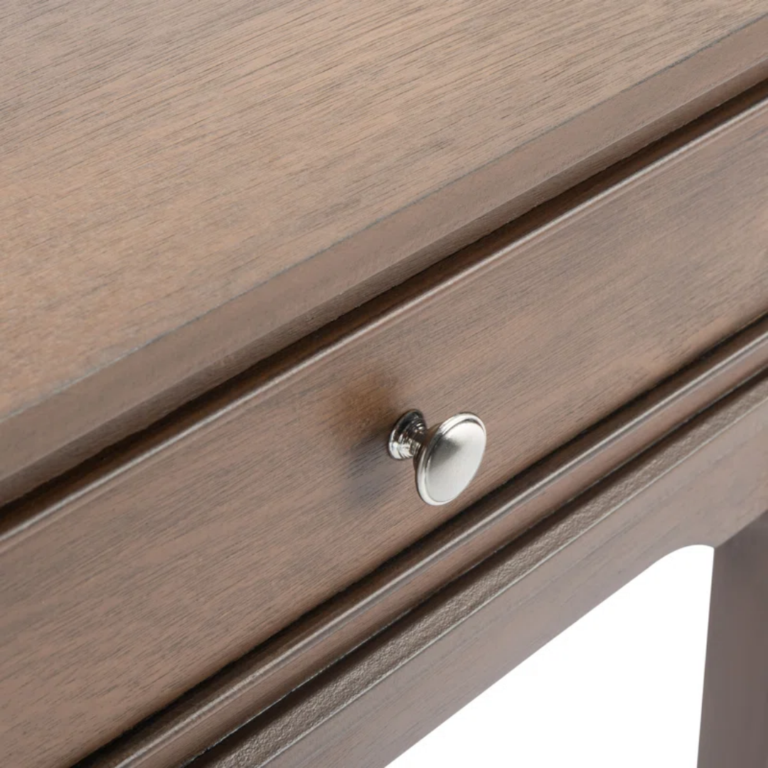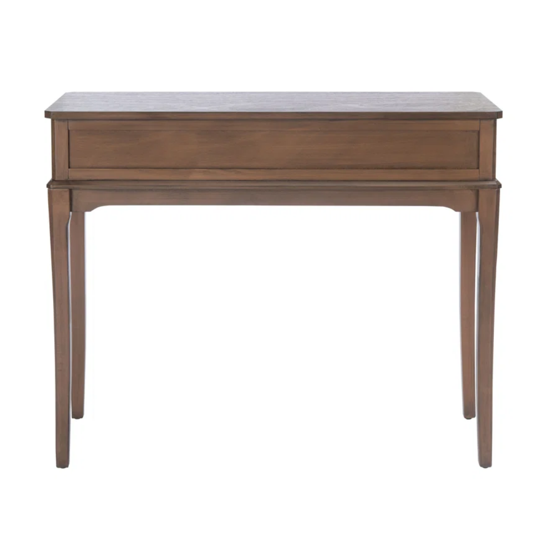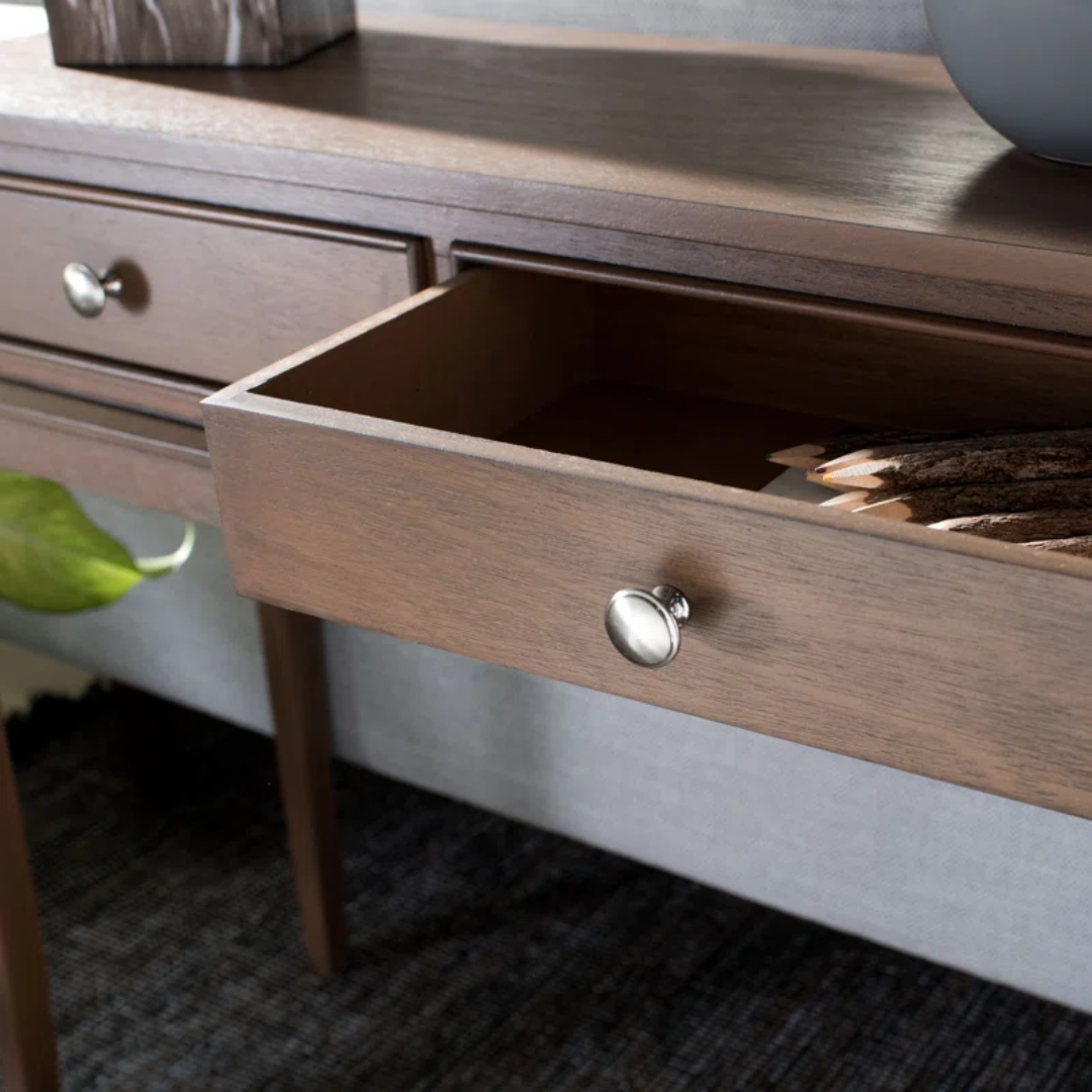 This console table clears up the clutter in your entryway or living room while adding a rustic look to your décor. It features two drawers just right for tucking away keys, pet leashes, and mail, while an open space underneath is ideal for a set of baskets or a show organizer. We love that the spacious surface is ideal for lamps and accent pieces. This table is crafted from solid and engineered wood with plenty of distressing for a vintage-inspired feel. Plus, it features scalloped apron details and shiny chrome-finished handles for an extra layer of charm in your space.