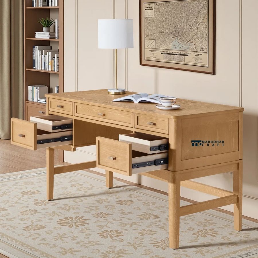 Enhance your workspace with this premium solid wood study table, designed to offer both elegance and high functionality. Featuring a spacious tabletop and multiple storage drawers, this desk provides excellent organization for files, stationery, and work essentials. The natural wood finish, clean lines, and sturdy frame give it a timeless appeal that fits perfectly in home offices, study rooms, or professional workspaces. Built for durability and daily use, this desk combines comfort, style, and practicality.