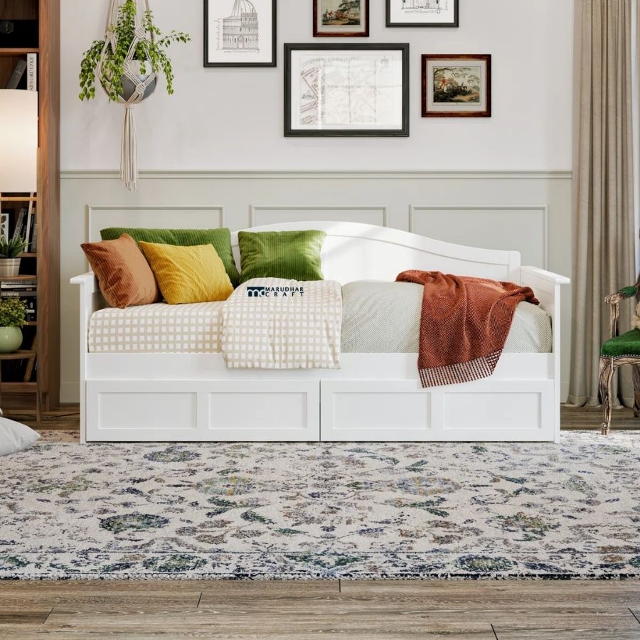 The Pure White Wooden Daybed with Storage Drawers is a perfect blend of elegance and practicality. Designed with a clean white finish and classic styling, this daybed functions as a comfortable sofa during the day and a relaxing bed at night. Built-in storage drawers beneath the frame provide ample space for bedding, cushions, or daily essentials, making it ideal for modern homes and compact living spaces.