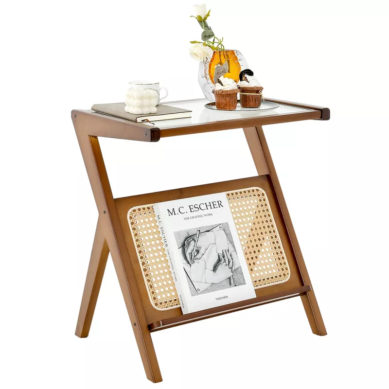 Rattan Side Table with Tempered Glass Top – Bamboo Frame End Table