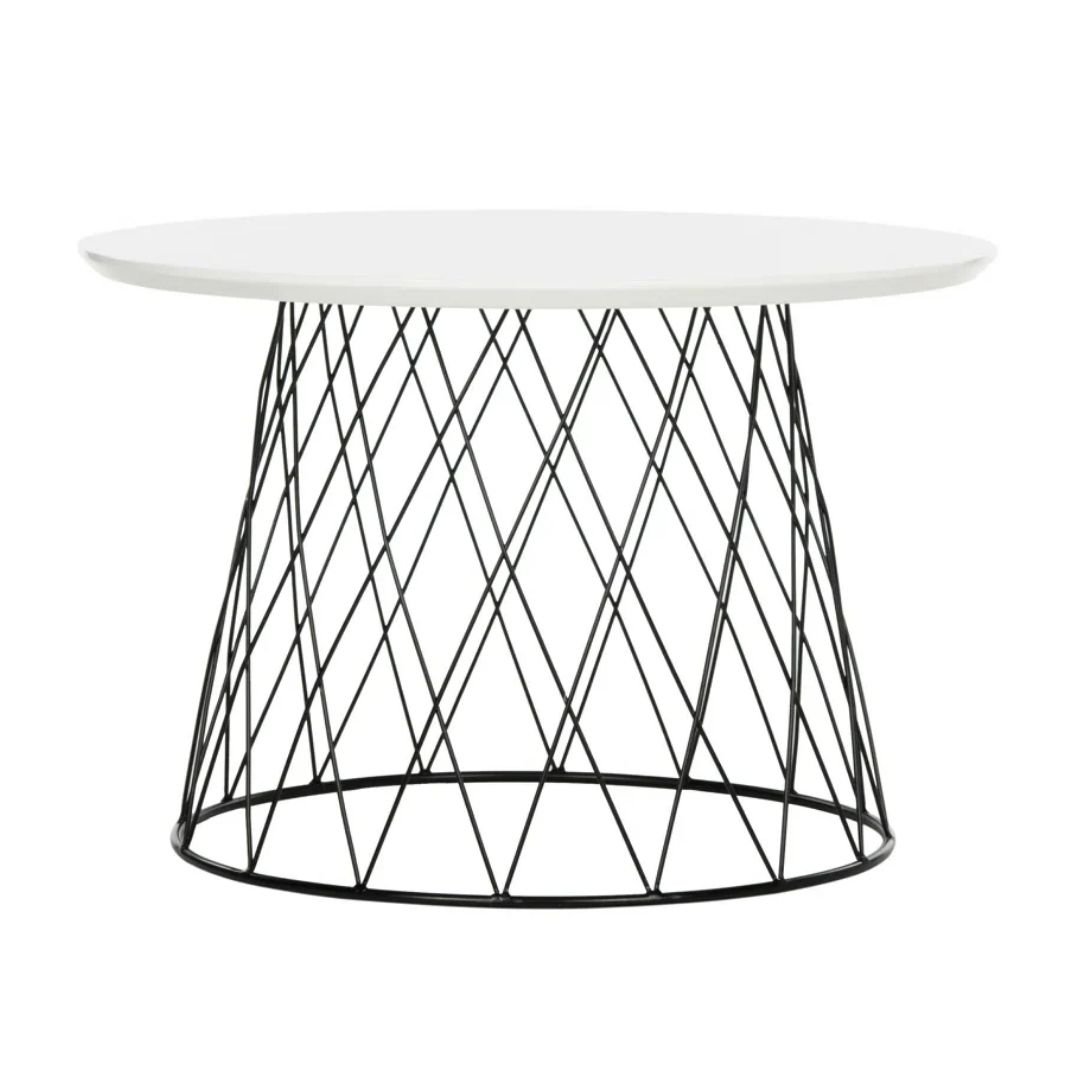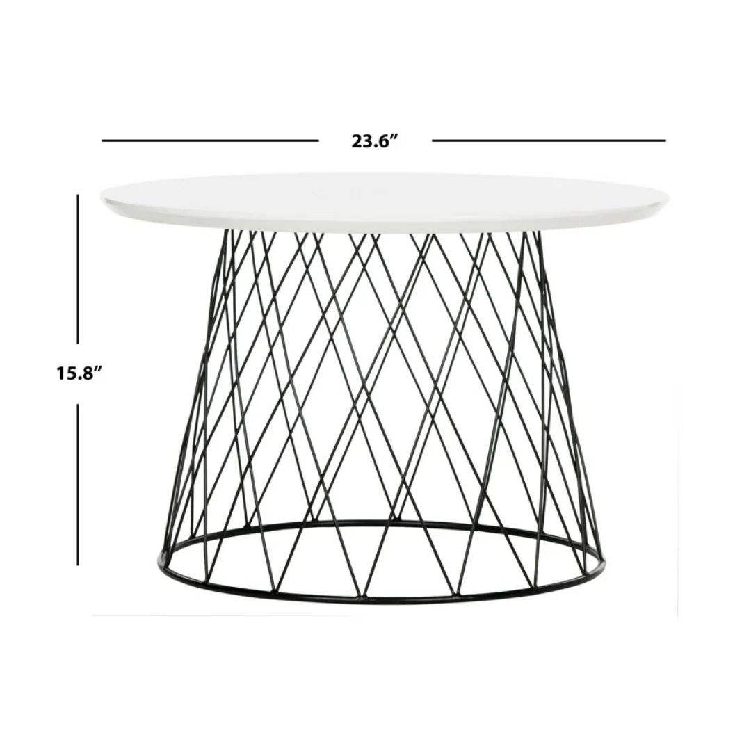 With its curving silhouette and mixed-media look, this coffee table is an artful accent that doesn’t skimp on function. Its base is crafted from iron in a versatile black finish, showcasing a cylindrical design with slender crisscrossing details. A circular manufactured wood top features a crisp finish for a note of contrast. It’s perfectly sized to sit sofa side.