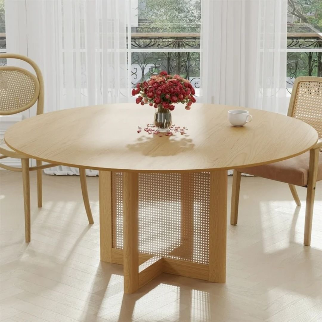 This Round Solid Wood and Rattan Dining Table combines timeless elegance with sturdy craftsmanship, making it the perfect centerpiece for any dining room. Its round shape promotes conversation and creates a welcoming atmosphere for family meals or gatherings. Crafted from premium solid wood, this round kitchen table boasts a durable, scratch-resistant surface that ensures long-lasting beauty. The natural wood grain adds a touch of rustic charm, this table comfortably seats 4-6 people, making it a versatile choice for everyday dining or special occasions.
