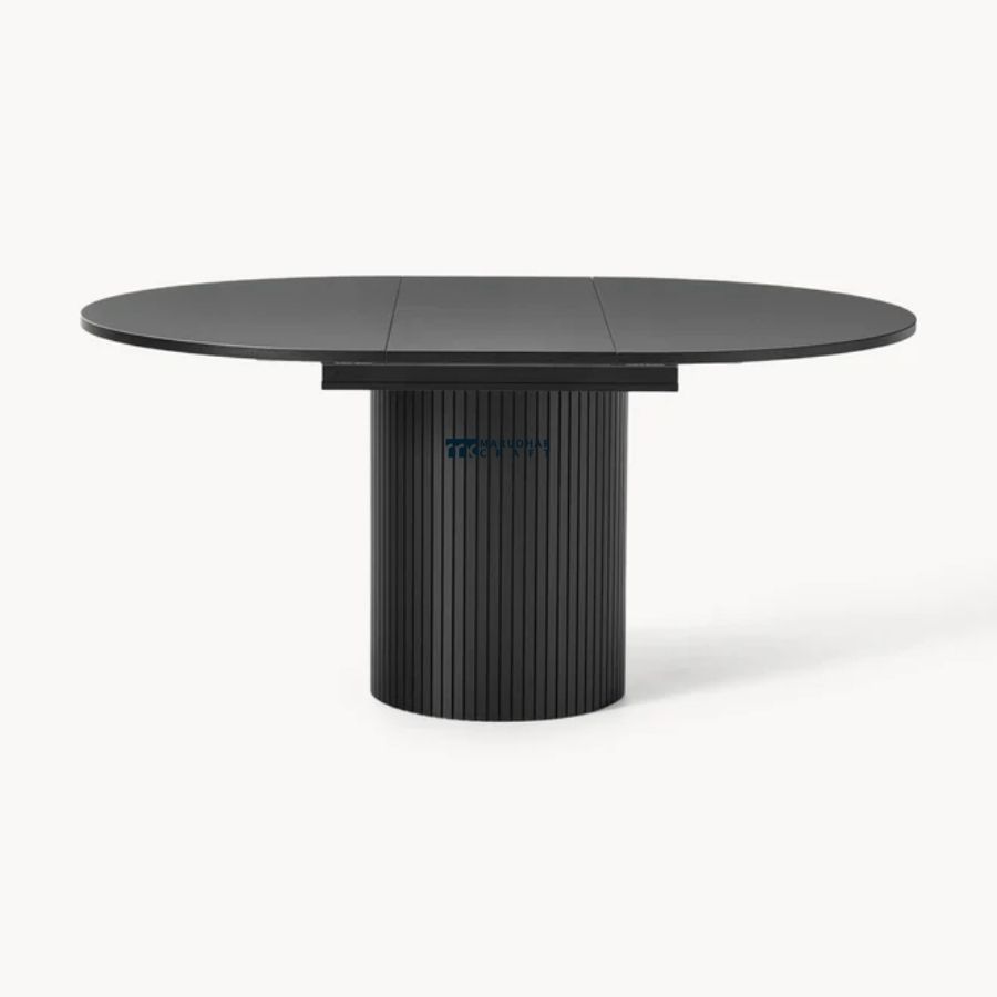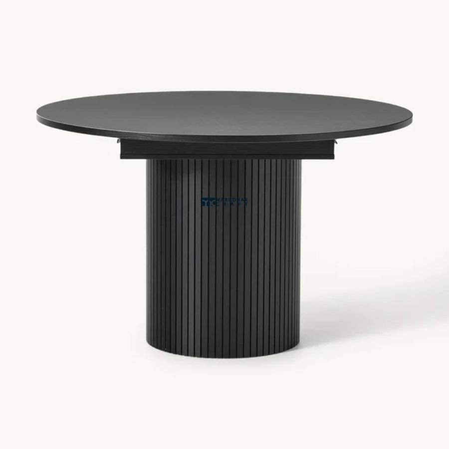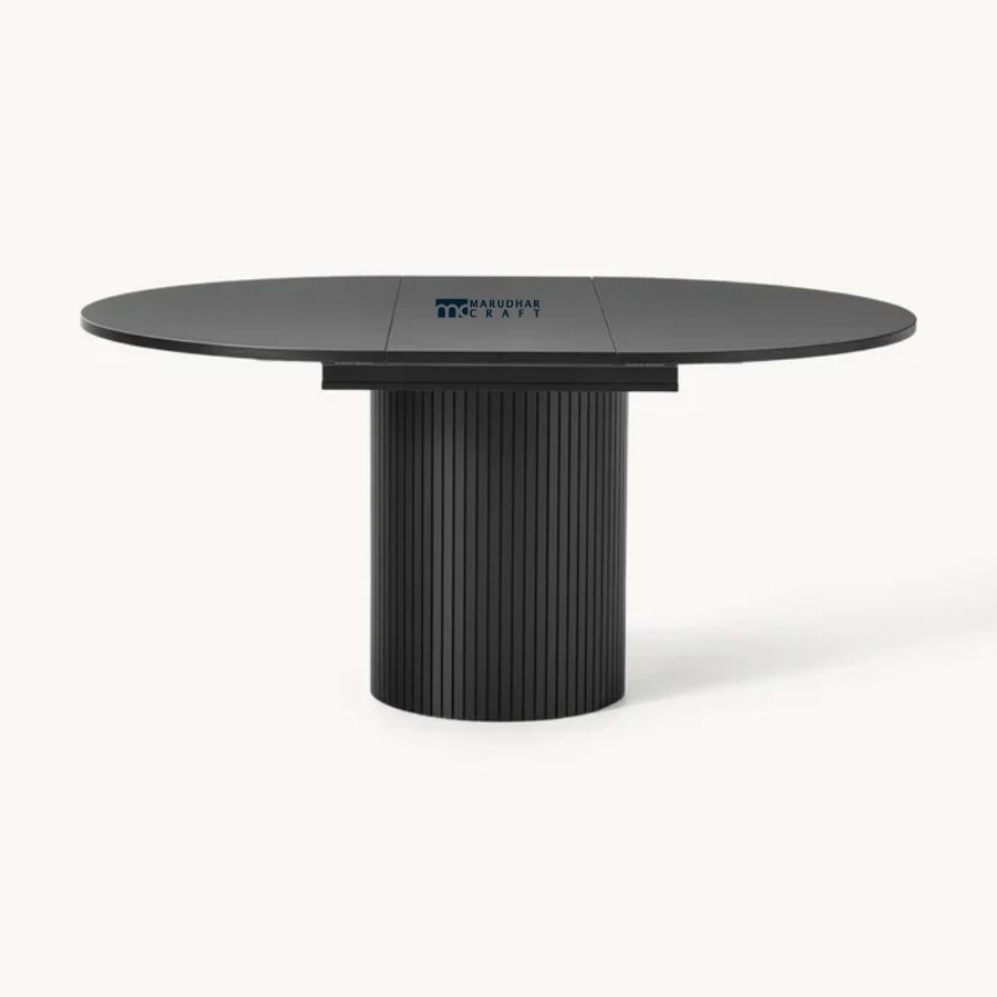This elegant round dining table features a sleek black tabletop paired with a vertically fluted pedestal base. Its sculptural form and modern finish make it a refined centerpiece for contemporary dining spaces, offering both stability and timeless style.