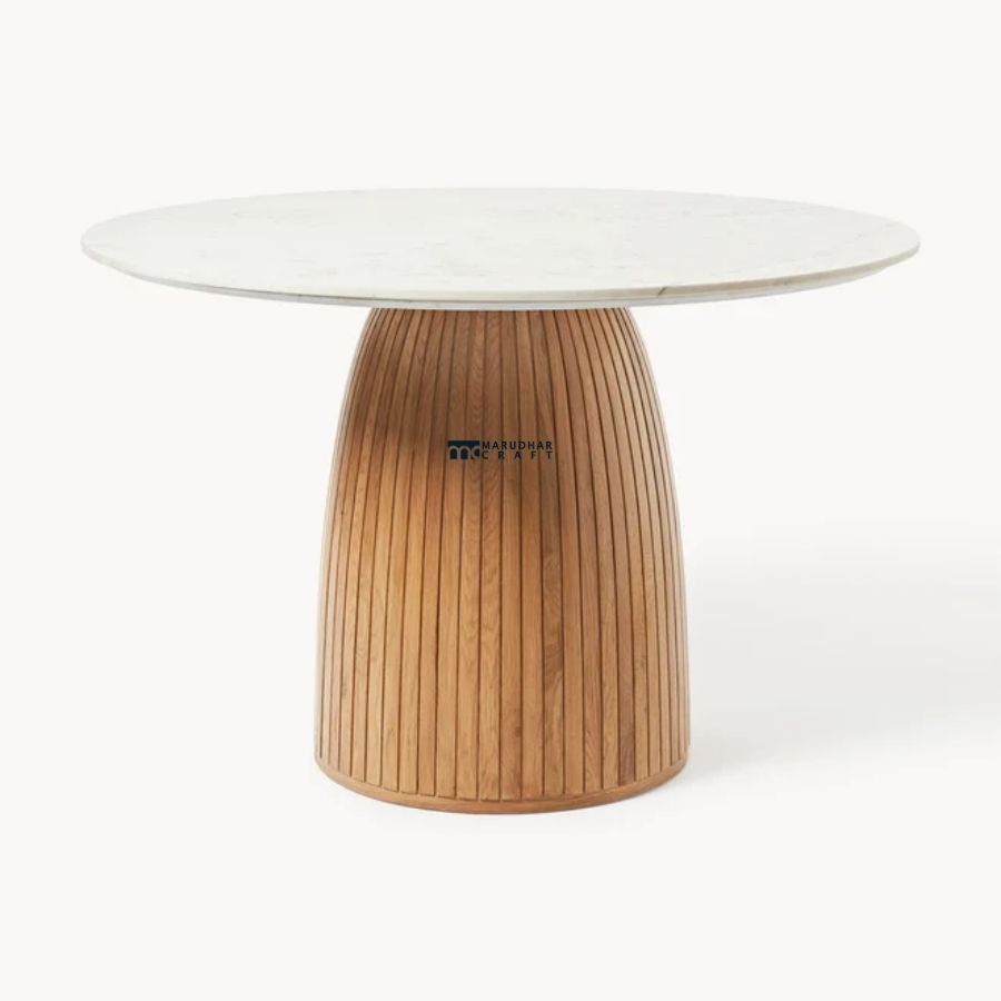 This refined round dining table features a smooth marble tabletop paired with a sculptural fluted wooden pedestal base. Designed to balance elegance and durability, it serves as a statement piece for modern and contemporary dining spaces.
