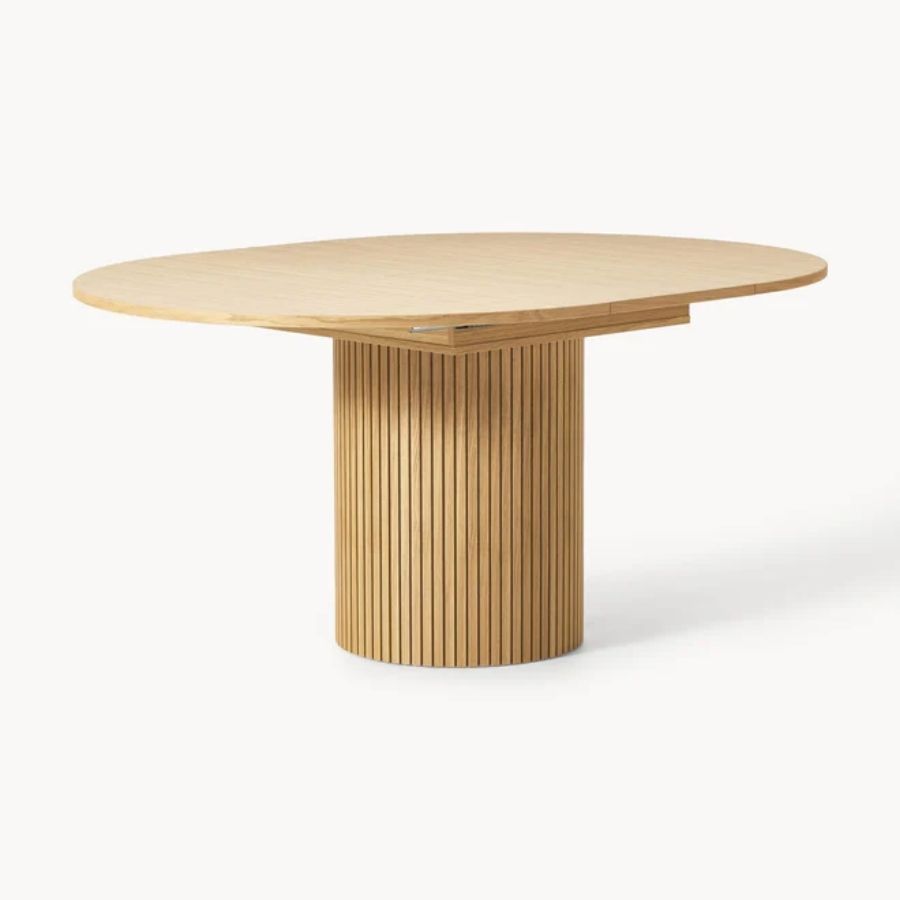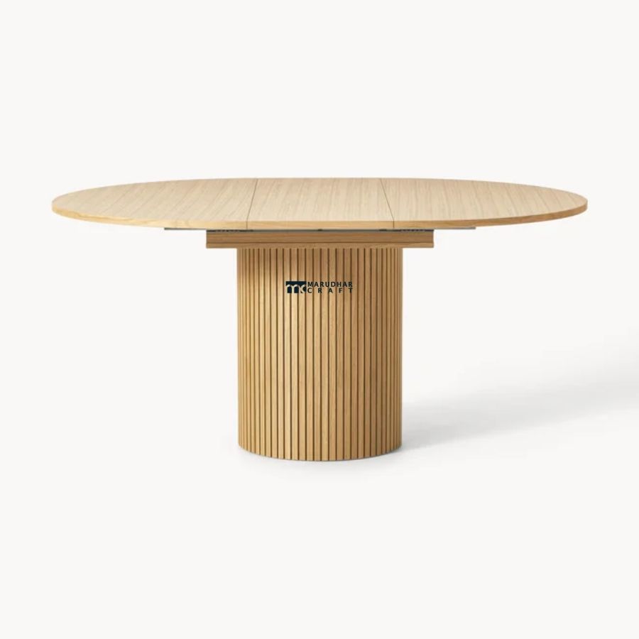 This elegant round dining table is crafted from solid wood and features a beautifully fluted pedestal base. With its light natural finish and balanced proportions, it brings warmth, stability, and modern sophistication to contemporary and Scandinavian-inspired dining spaces.