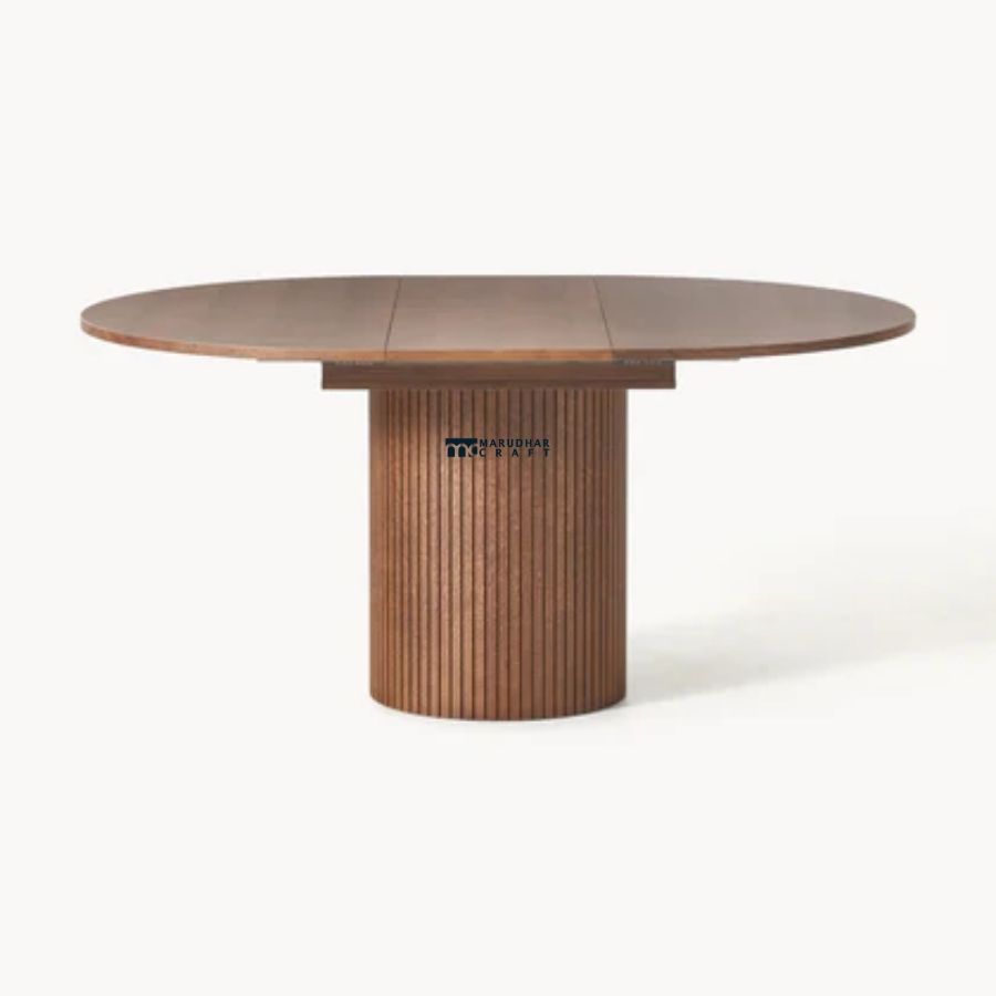 This round wooden dining table features a sculptural pedestal base with vertical fluting and a smooth, solid wood tabletop. Designed to bring warmth and sophistication to modern interiors, it serves perfectly as a dining table or a statement table for casual gatherings.