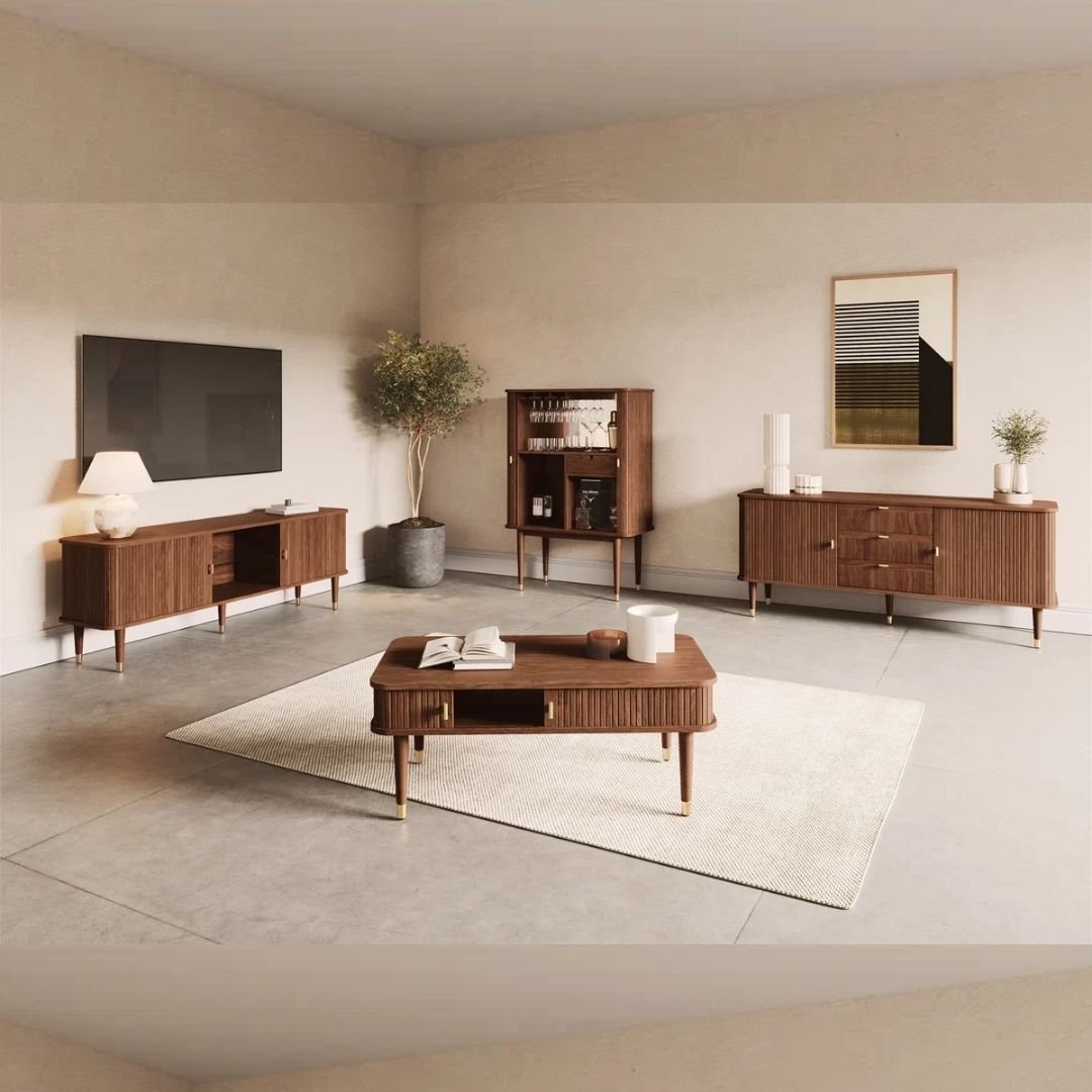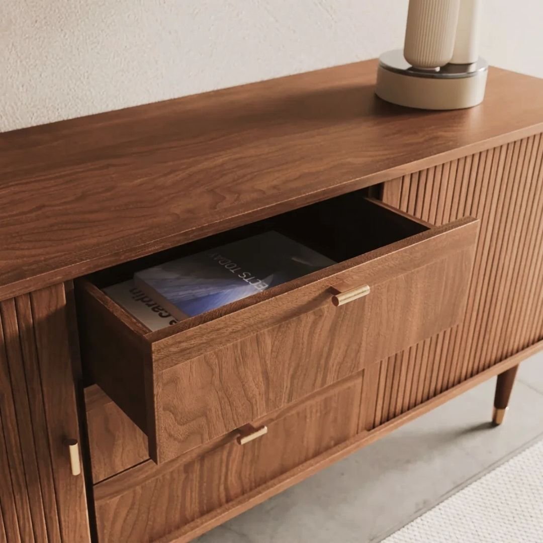 - 𝐒𝐌𝐀𝐑𝐓 𝐒𝐋𝐈𝐃𝐈𝐍𝐆 𝐓𝐀𝐌𝐁𝐎𝐔𝐑 𝐃𝐎𝐎𝐑𝐒: The Sideboard’s intelligent sliding tambour doors make it simple to access storage without being obstructed by conventional swing doors. Ideal for busy living areas, the tambour doors facilitate quick retrieval of items and maintain a clean, uncluttered look, making this walnut and muted oak sideboard both practical and stylish.