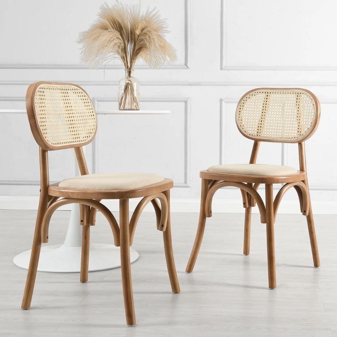 Wooden Set of 2 Cane Rattan and Upholstered Dining Chairs, Natural Colour
