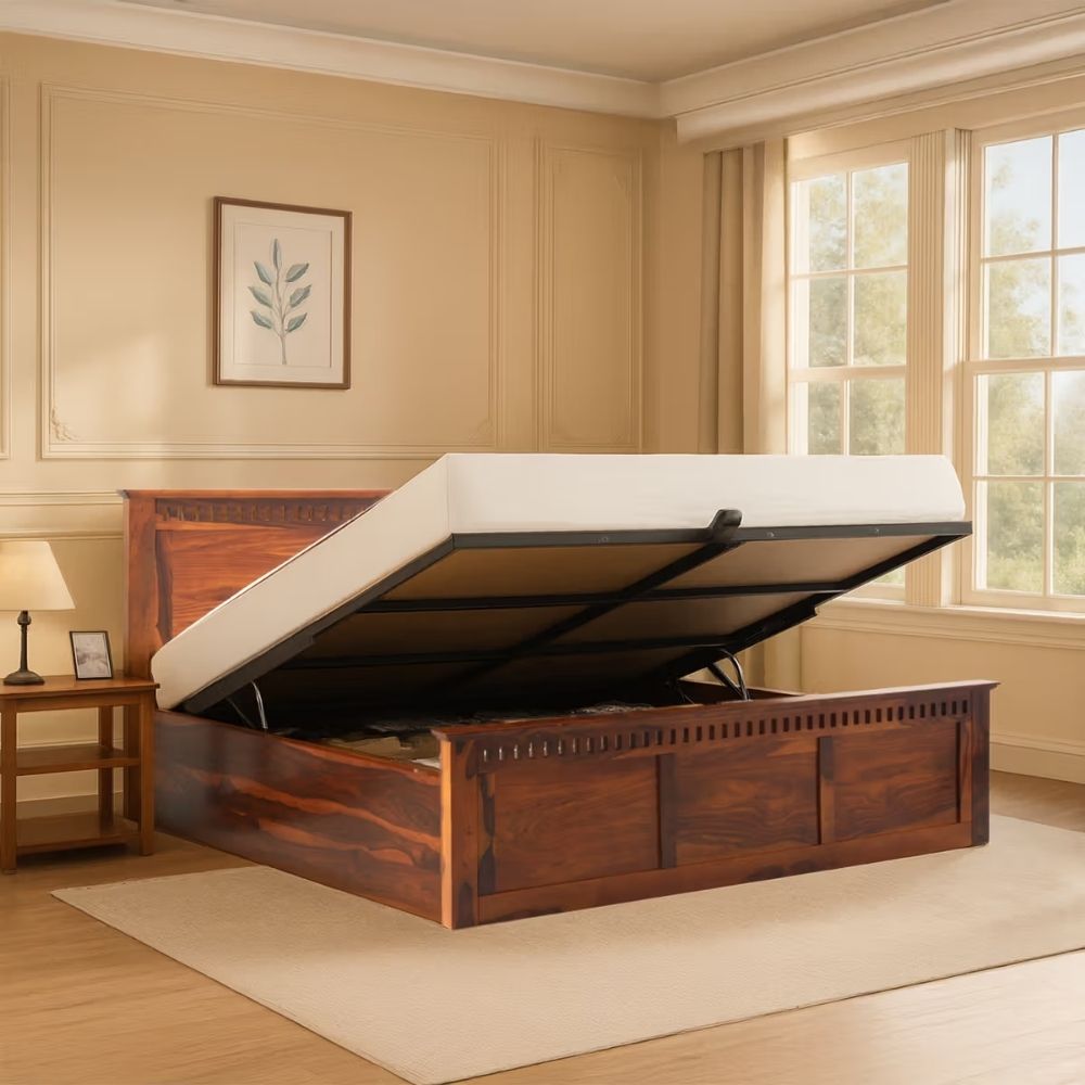 Experience the perfect blend of luxury, strength, and modern functionality with this Sheesham King Hydraulic Bed, crafted from premium-quality Sheesham wood. Known for its rich grain patterns, exceptional durability, and natural elegance, Sheesham wood brings warmth and sophistication to any bedroom décor.