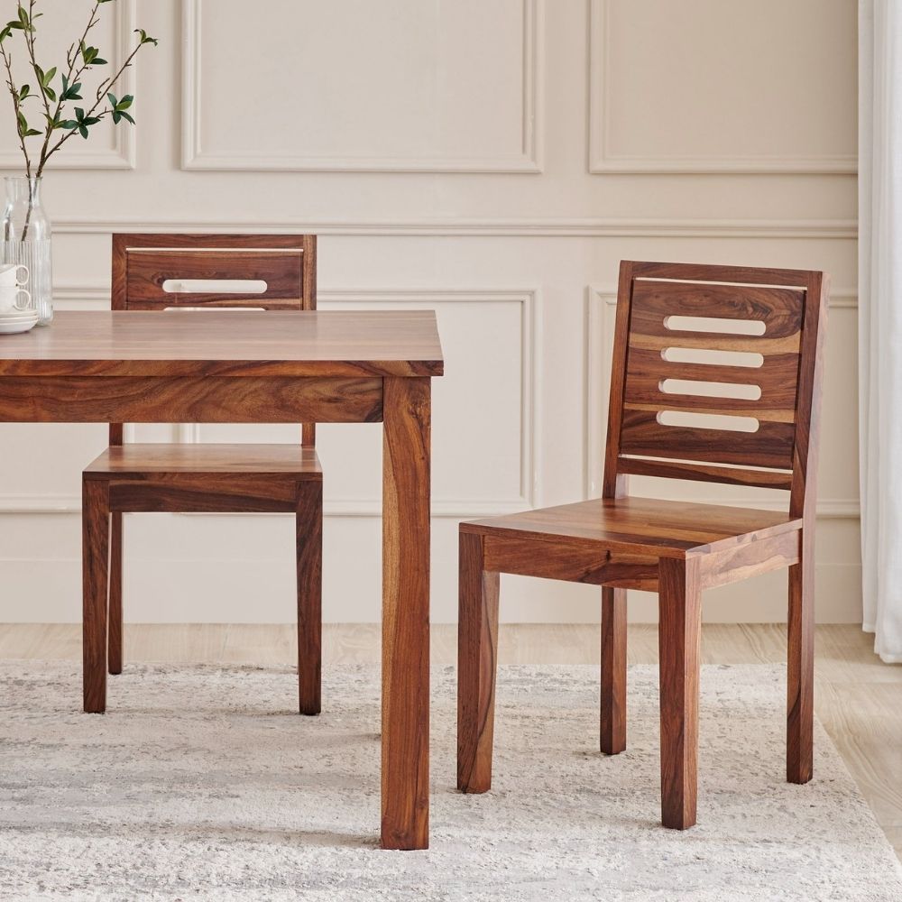 This 4-seater dining table set combines durability and style, crafted from kiln-dried, chemically treated sheesham wood with a matte finish for a smooth, natural feel. Its design minimizes seasonal expansion, making it perfect for indoor use. Reinforced laminated wooden legs enhance strength and weight capacity, while a polymer-based paint provides a sleek, reflective finish for a cohesive appearance on both panel fronts and edges. The dining chairs, also made from kiln-dried and chemically treated sheesham wood with a matte finish, are safe for indoor use and resistant to seasonal changes. Their medium back offers excellent support for upright sitting, featuring a more pronounced design than low-back models.