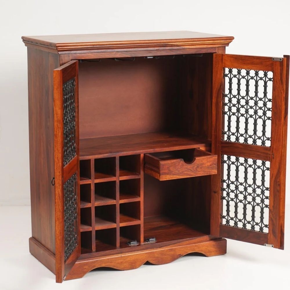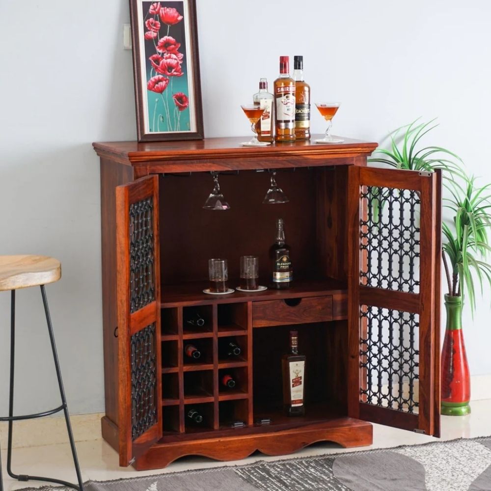 Bring home a premium Sheesham Wood Bar Cabinet in Maple Finish, crafted to add warmth, richness, and functionality to your space. Made from solid sheesham wood, this stylish bar cabinet offers spacious storage for bottles, glassware, and bar accessories. Its natural wood grains and smooth maple finish make it an elegant choice for modern Indian homes.