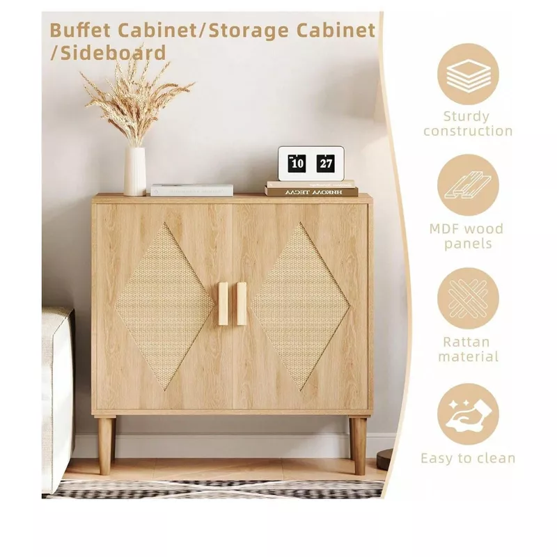 This sideboard buffet kitchen storage cabinet features handmade rattan doors that add a natural, warm touch to your interior. Crafted from durable wood, it offers a stylish yet functional storage solution for kitchens, dining areas, or living spaces. Its low-profile design makes it ideal for compact areas while still providing practical storage for everyday essentials.