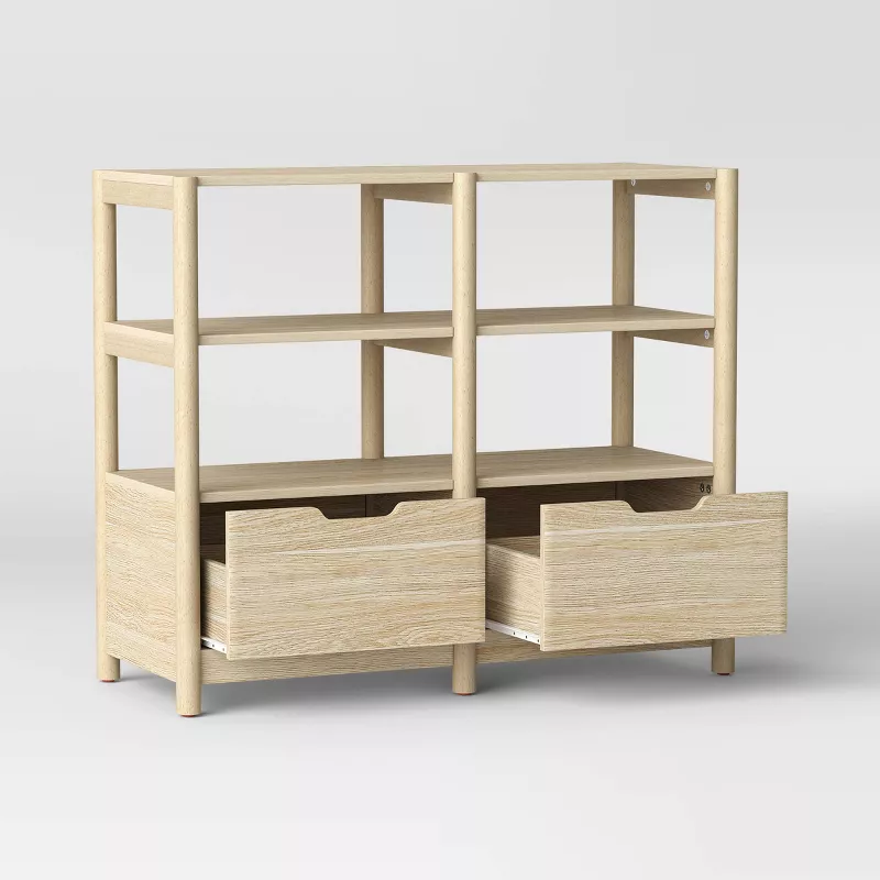 Bring warmth and smart storage to your home with this beautifully designed small bookcase with drawers. Featuring a natural wood finish, this compact yet spacious storage unit blends modern style with everyday functionality. It offers two open shelves for books, décor, or storage baskets, along with two smooth-gliding drawers to keep smaller items neatly organized and out of sight.