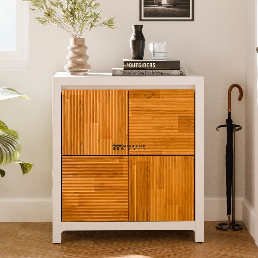 Bring a fresh and modern look to your interiors with this solid wood accent storage cabinet, featuring elegant fluted wooden panels framed in a crisp white structure. The warm natural wood texture paired with the clean white finish creates a stylish contrast, making it an eye-catching piece for contemporary homes.