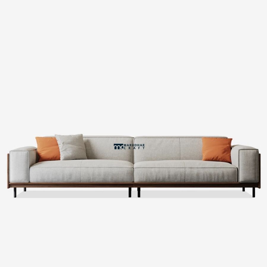 Designed to be admired from every angle, this premium 3-seater sofa features a full solid-wood back panel with a rich walnut finish. Upholstered in soft, neutral fabric, it offers a perfect balance of modern aesthetics, comfort, and durability—ideal for open living spaces and contemporary interiors.